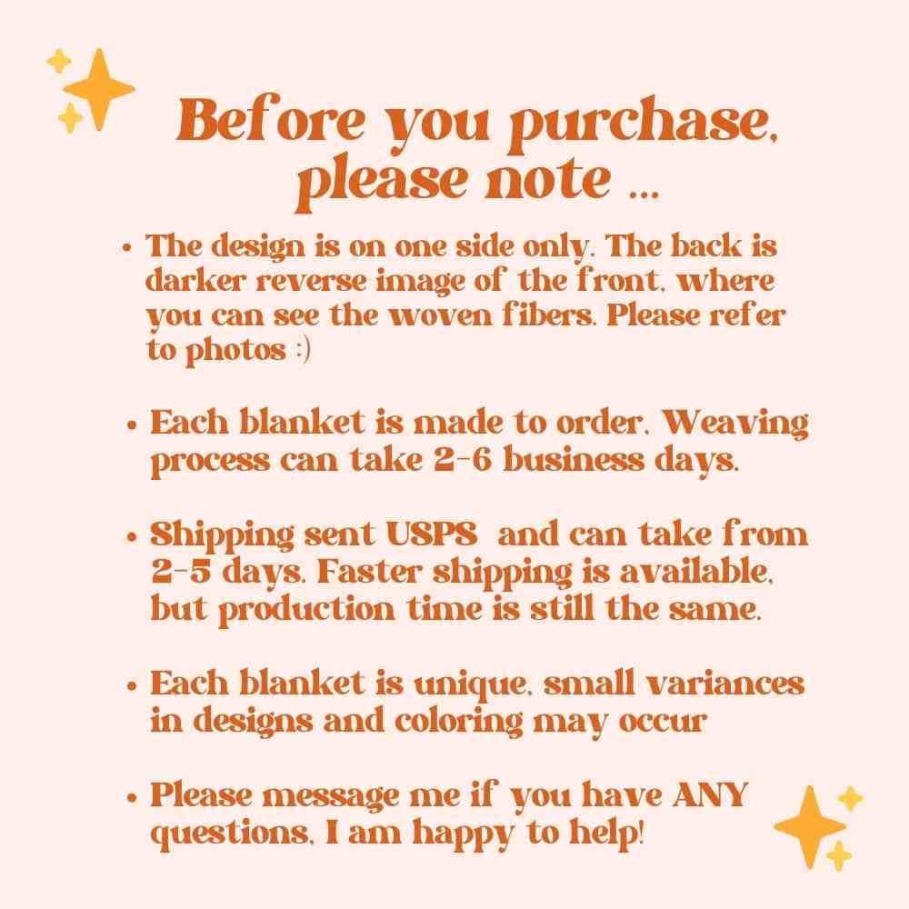 This woven blanket is made with a Jacquard loom, which weaves different colors of cotton yarn threading to create the fun designs. Each blanket is designed by me, then woven by my textile partner in NC, USA, then shipped to you to enjoy!