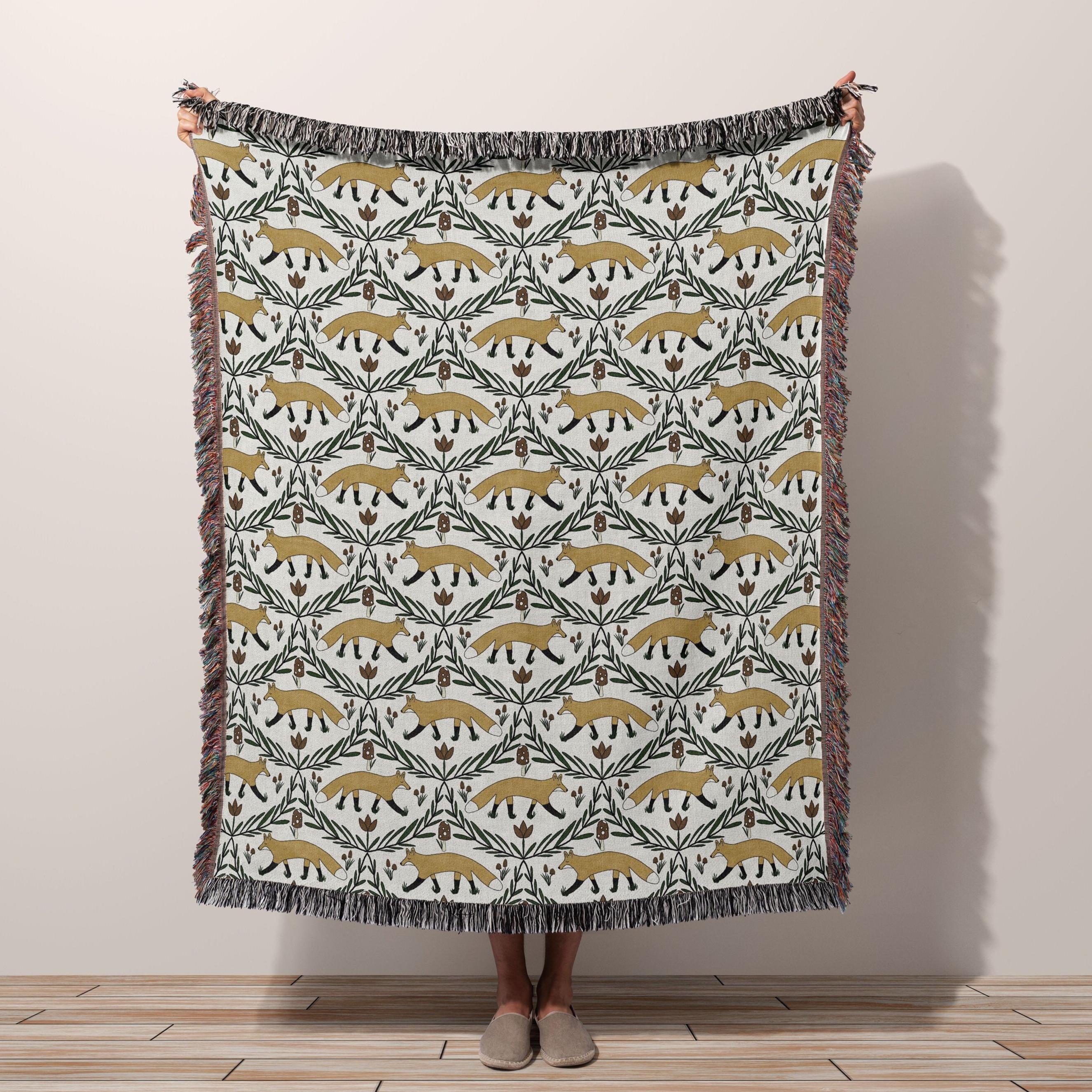 100% Cotton woven throw blanket featuring a woodland forest with foliage and mushrooms and a roaming goc make this cute and soft throw blanket the perfect addition to your cottagecore decor. It’s a premium, lightweight throw blanket made from natural cotton. Super soft to touch, beautifully textured and wonderfully cozy. Perfect for bed or to make your couch extra comfy.