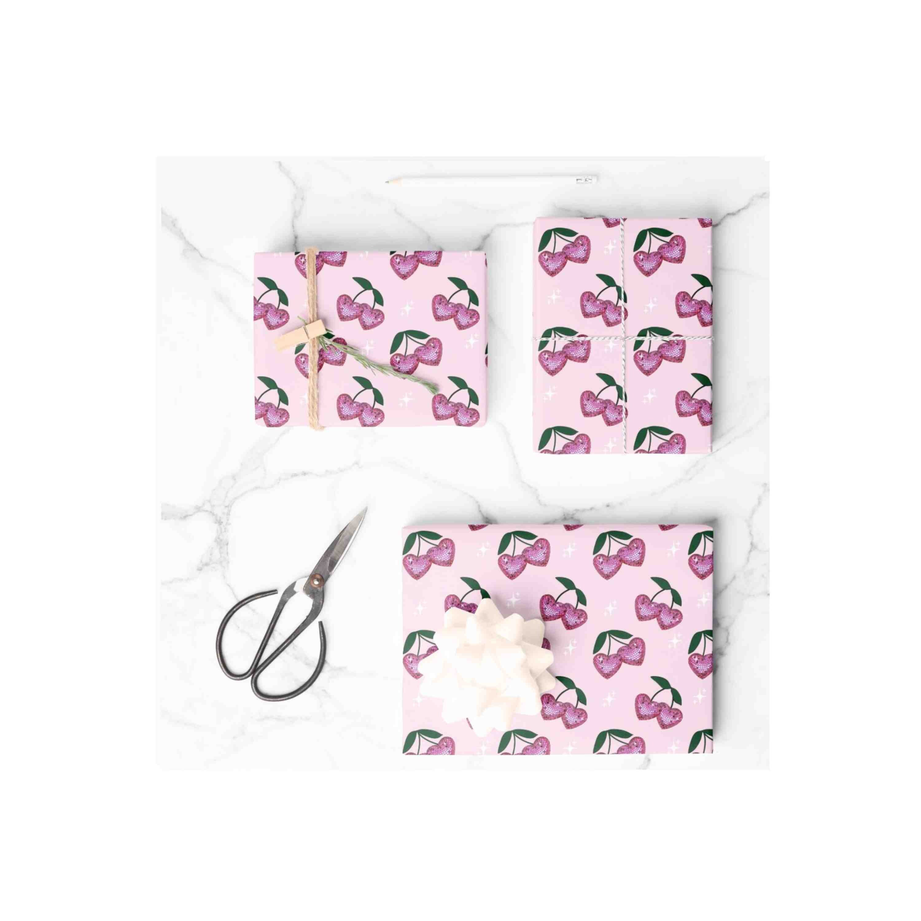 Cute heart shaped cherry disco balls, hand drawn pattern on this high quality gift wrap! It's great for any birthday, anniversary, valentine's or valentines day!
