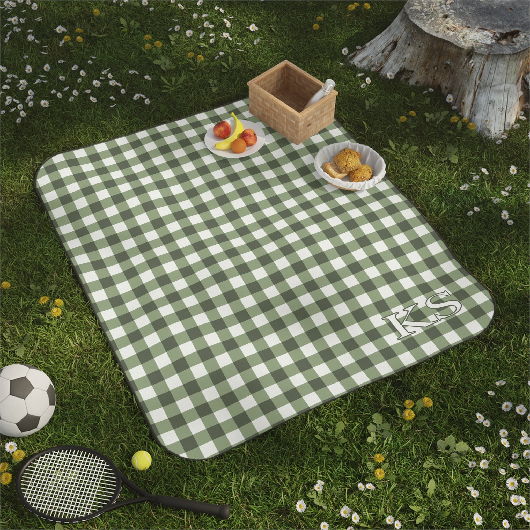 A lovely sage green gingham pattern with a personalized monogram makes this soft blanket perfect for a sunny picnic or bring along to your favorite sporting event for comfort.