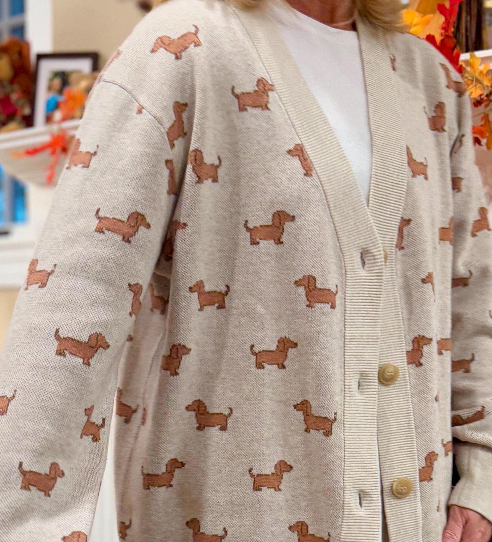 Thank you for stopping by!Wrap yourself in cozy charm with this delightful dachshund cardigan sweater, perfect for any dog lover! Featuring an adorable dachshund print that brings a playful touch to your outfit, this cardigan combines warmth, comfort, and style in a way that’s hard to resist. Made with soft, high-quality knit, it’s designed to keep you feeling snug while looking effortlessly cute. The neutral sand background complements any wardrobe, making it easy to pair with jeans, leggings, or your favorite loungewear. Whether you’re lounging at home, heading out for a casual day, or simply want to carry a little dachshund love with you wherever you go, this cardigan is your go-to choice for a heartwarming style that stands out.