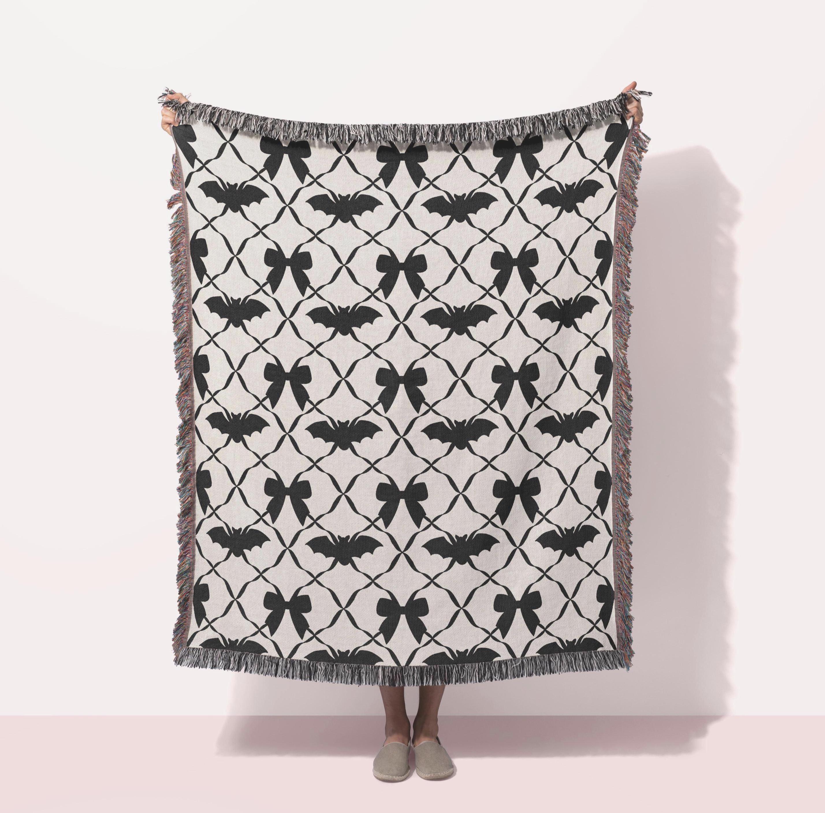 Cotton woven throw blanket featuring an enchanting bat and bow pattern in classic black on cream. This cozy Gothic-inspired blanket adds dark academia charm to any space with its intricate diamond lattice design and stylish fringe edges. Perfect for snuggling on the couch, bedroom decor, or as a unique gift for lovers of cottagecore and boho aesthetics. The cotton weave provides comfort while the striking bat motifs create a captivating focal point. Whether you're decorating for Halloween or year-round Gothic style, this versatile throw brings mysterious elegance to your home.