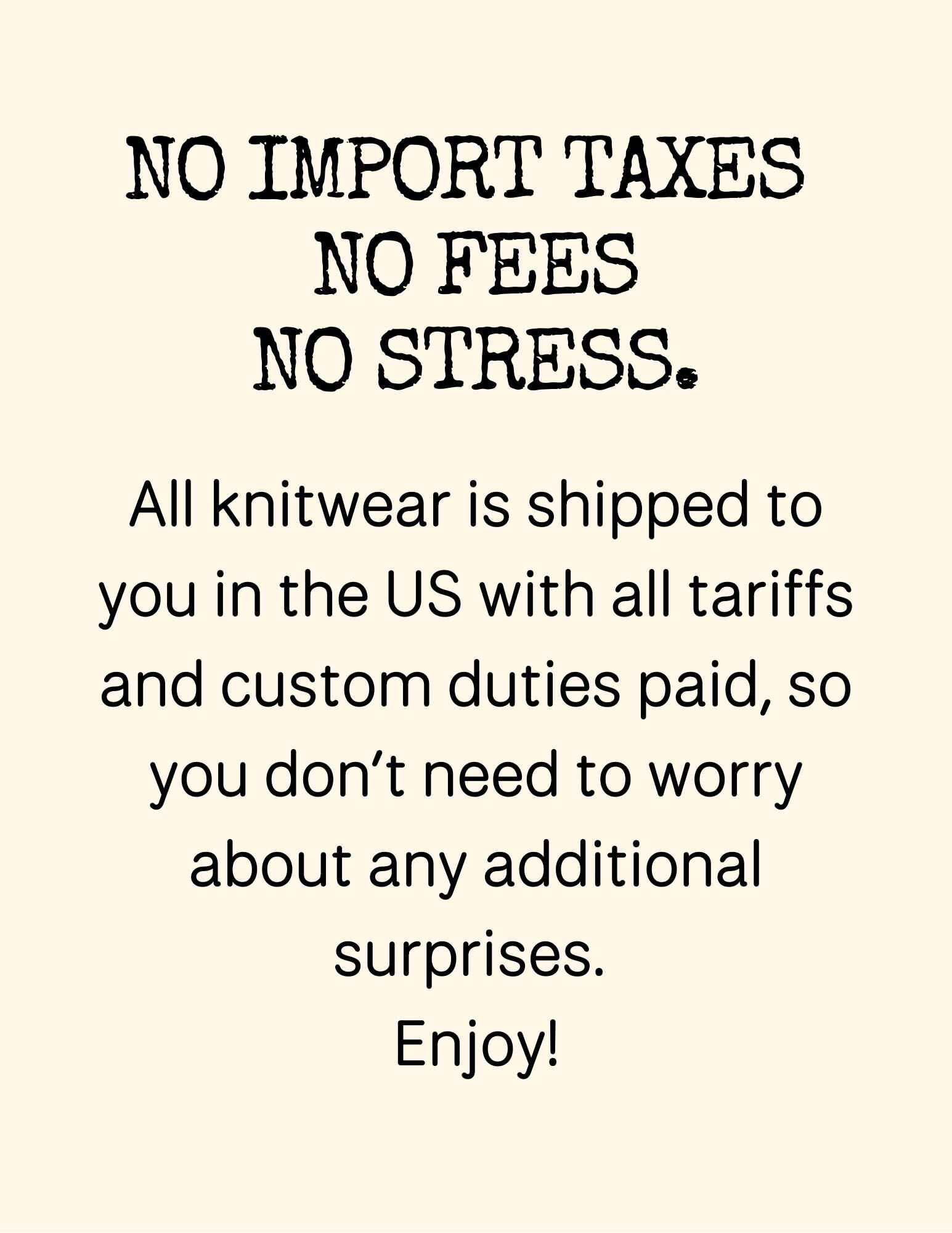 All knitwear is shipped to you in the US with all tariffs and custom duties paid, so you don’t need to worry about any additional surprises.