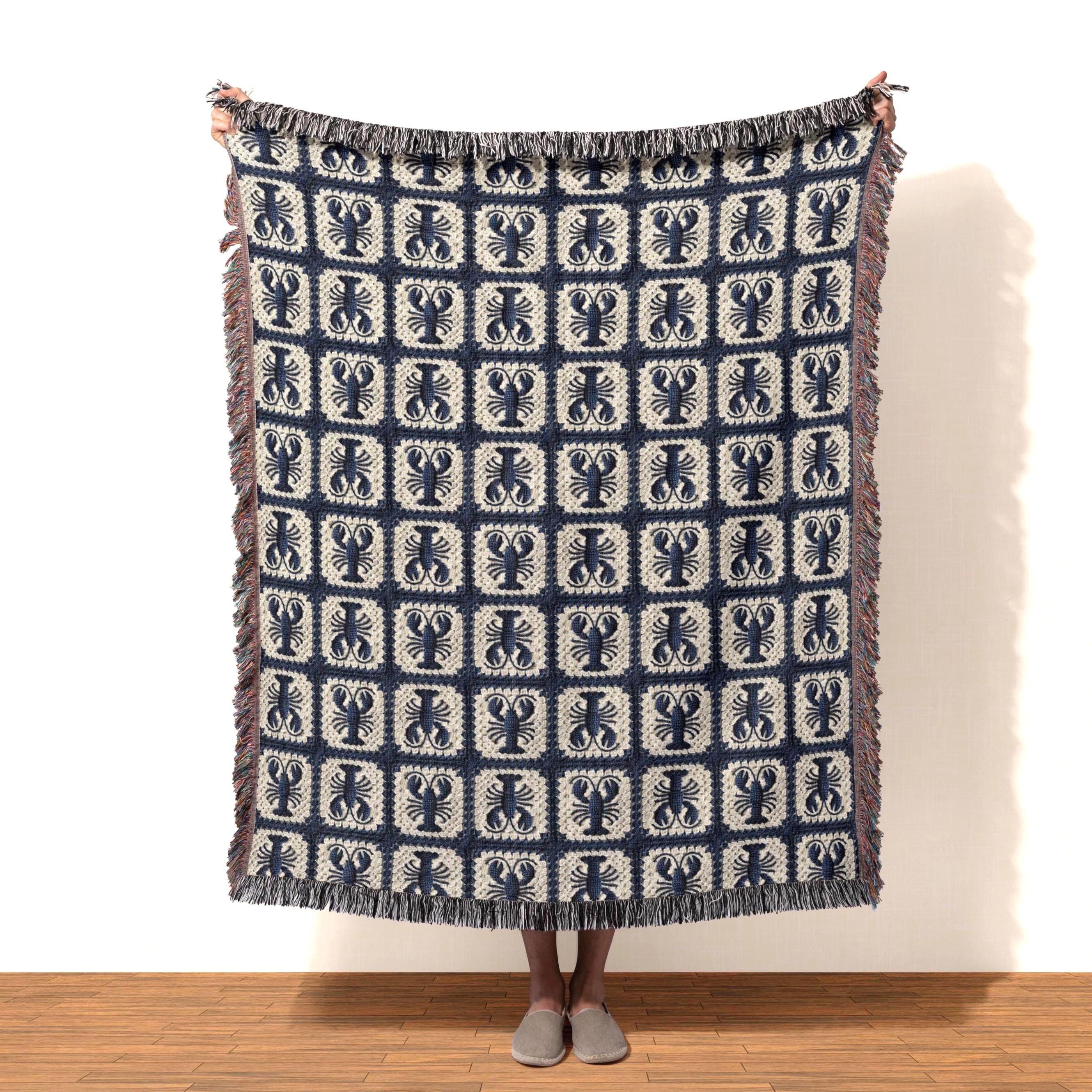 Perfect for the crochet lover who wants instant gratification - no waiting months for a custom piece! blanket features an adorable blue lobster motif within each granny square, creating a charming coastal pattern that's both whimsical and sophisticated.