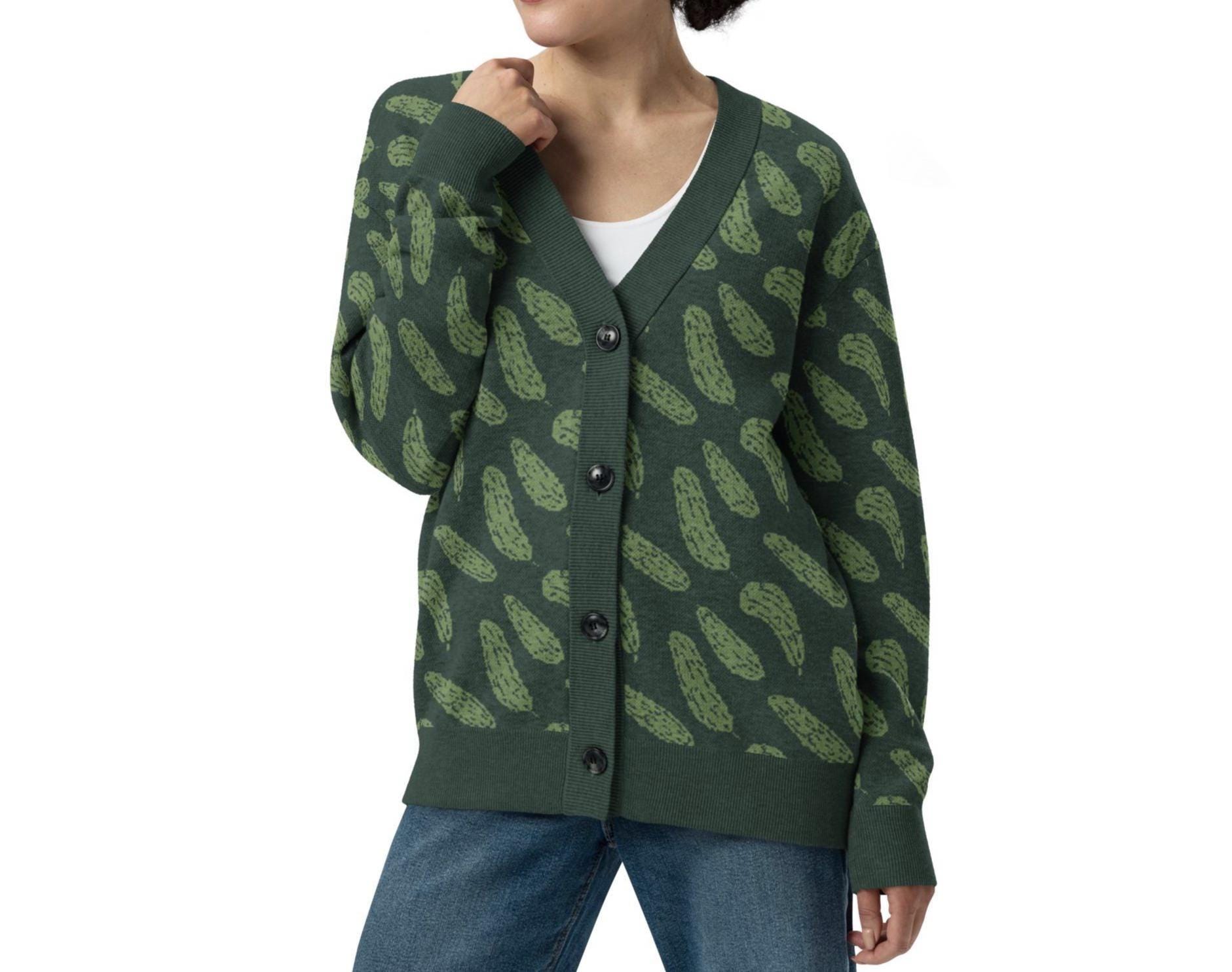 For the pickle lover who wears their obsession with pride! This adorable pickle-print cardigan is the perfect way to show your love for everyone's favorite crunchy snack. Whether you're a pickle enthusiast, dill devotee, or just someone who appreciates good food humor, this cozy cardigan brings the fun to your wardrobe.