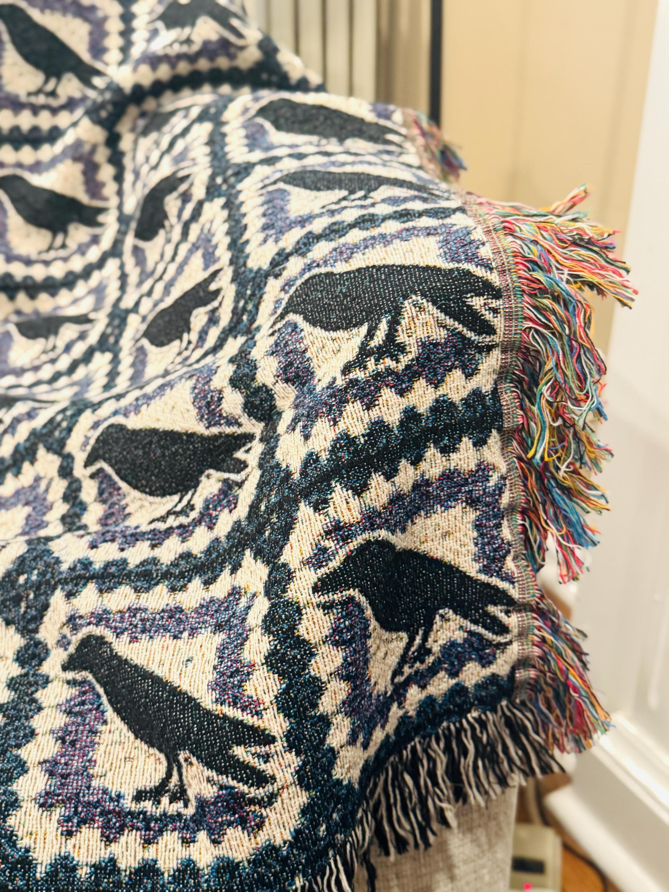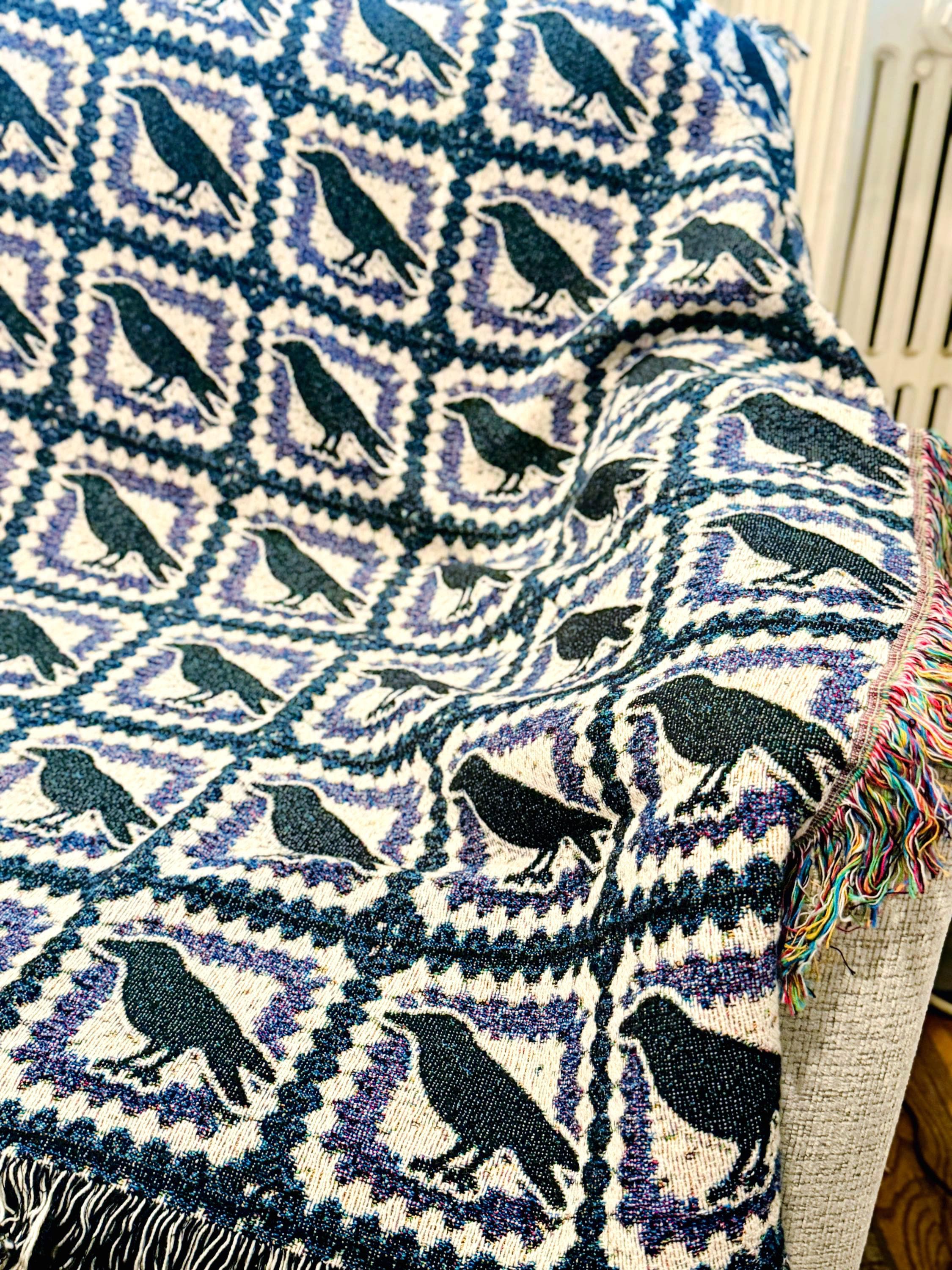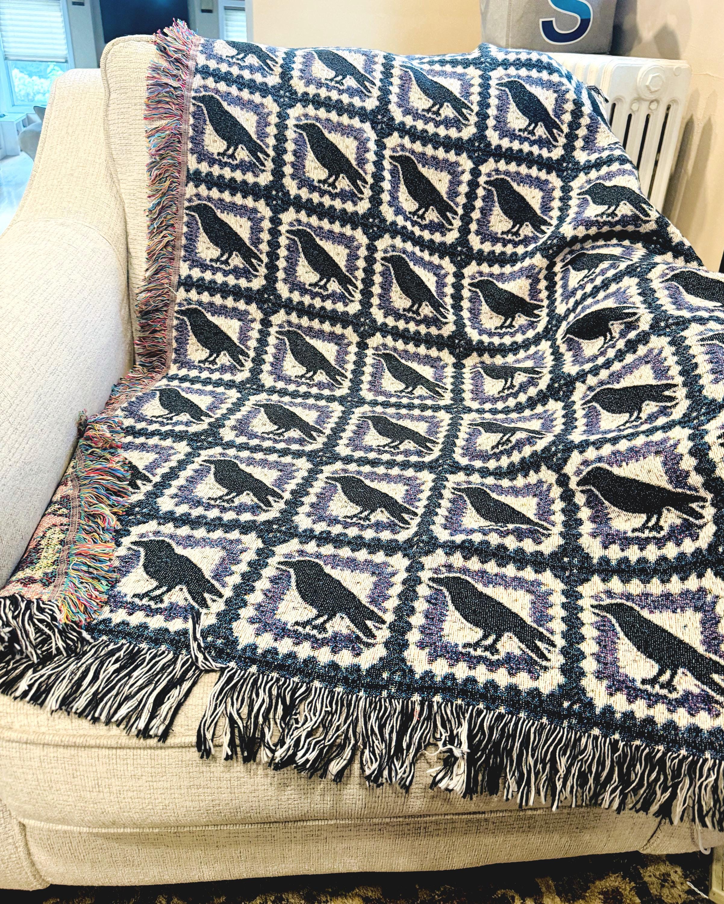Embrace your mystical side with this striking cotton woven throw blanket featuring a bold repeating pattern of elegant black ravens that adds dramatic flair to any space! This captivating oversized blanket showcases sleek crow silhouettes arranged in a sophisticated grid design, perfect for gothic decor, boho styling, or anyone who appreciates the beauty of these intelligent birds. Crafted from soft, durable cotton with decorative fringe edges, this versatile throw brings both comfort and conversation-starting style to your living room, bedroom, or reading nook. Whether you're a bird enthusiast, love dark academia aesthetics, or seeking a unique gift for someone who marches to their own beat, this remarkable raven blanket transforms any ordinary space into an extraordinary sanctuary.
