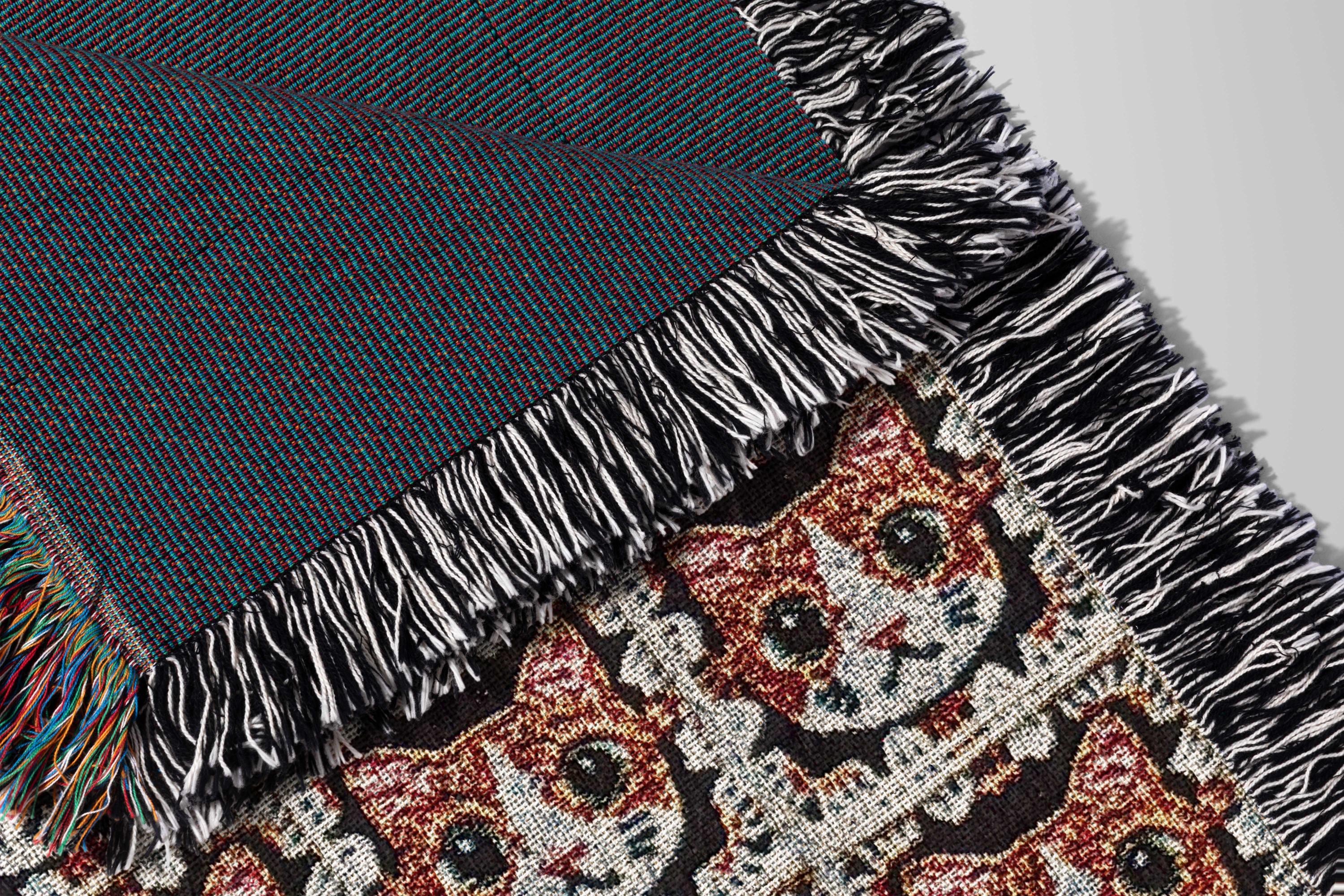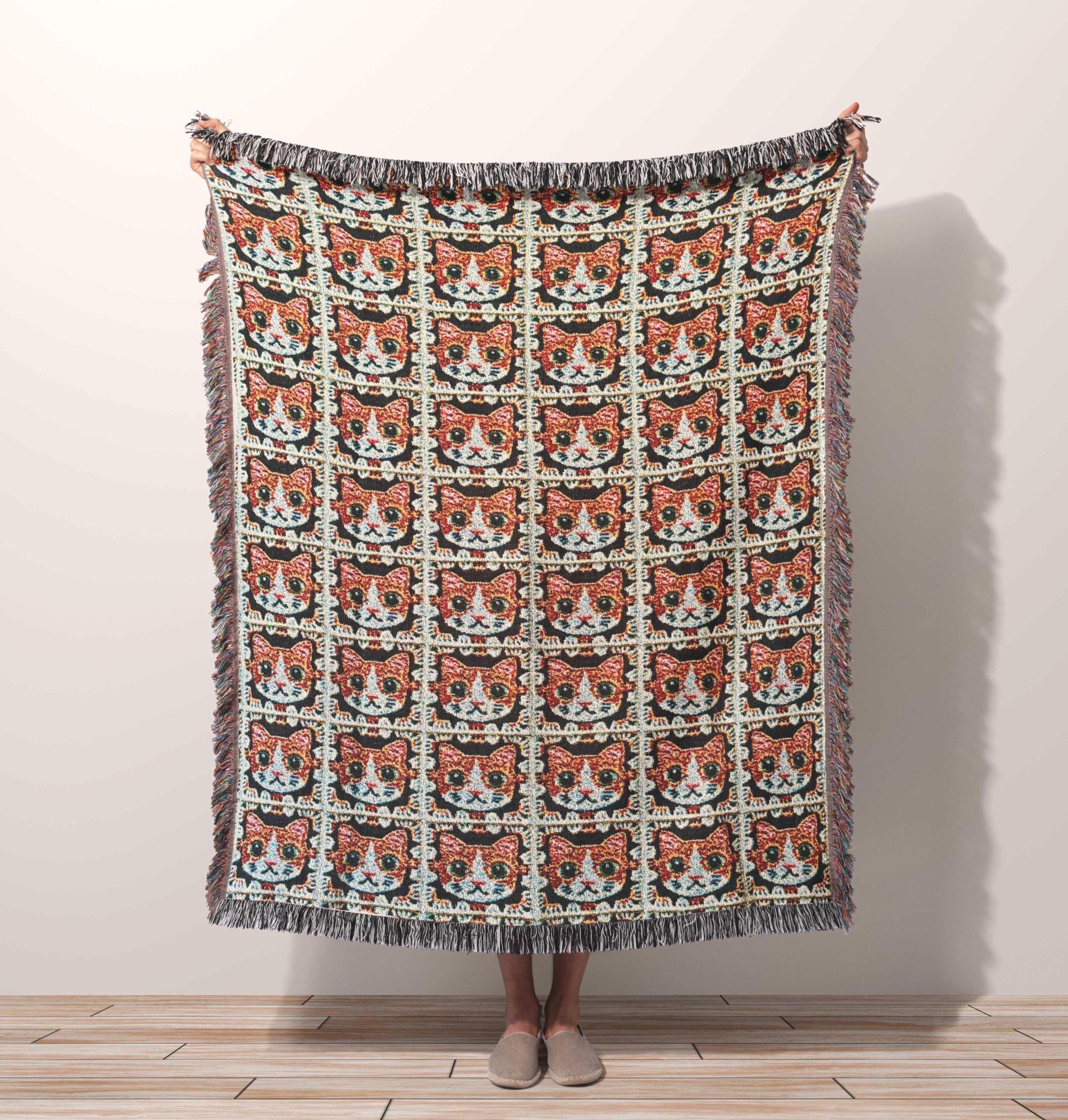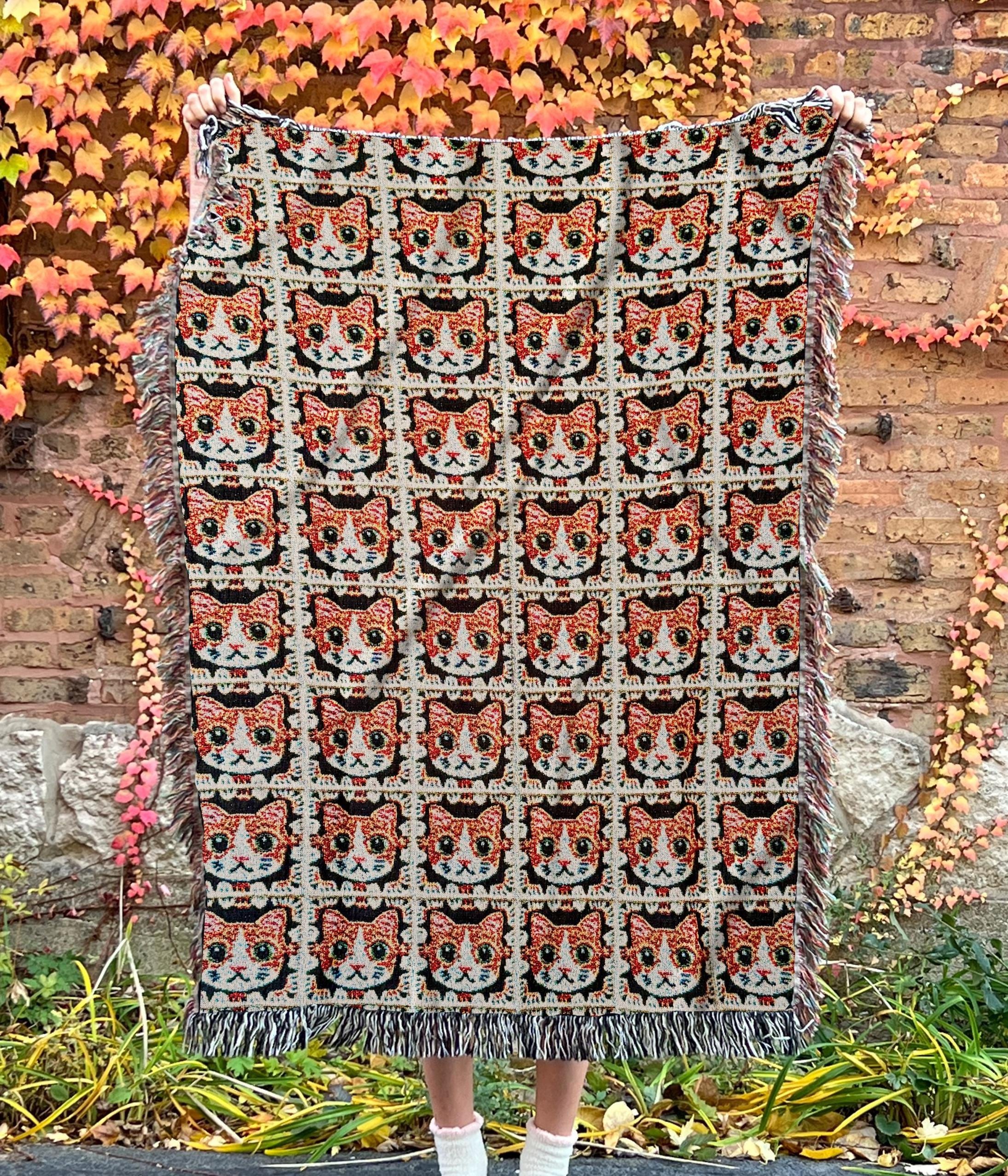 Featuring rows of bright ginger tabby faces and a timeless vintage-inspired design, this woven blanket is purrfect for cat lovers with style.