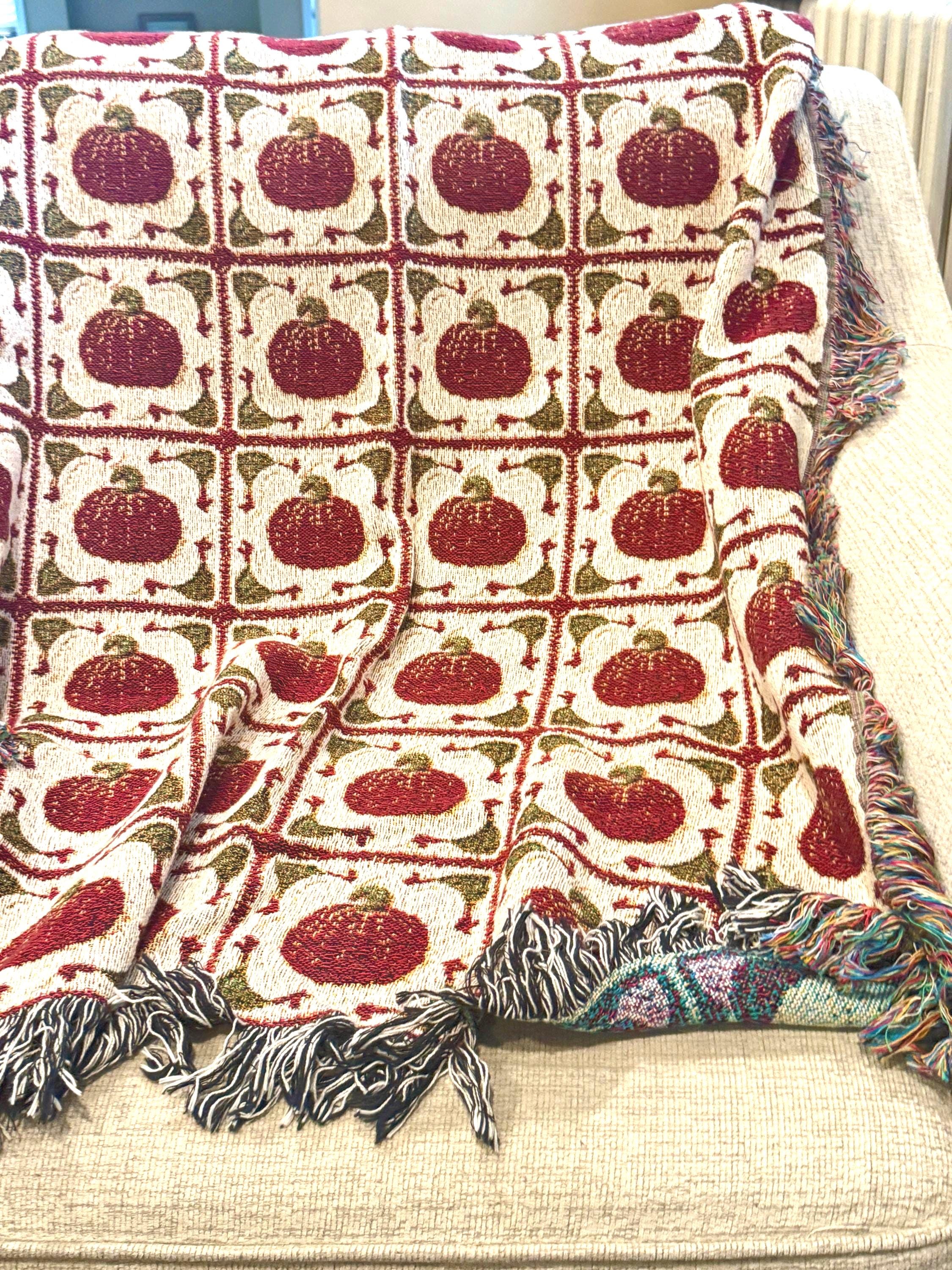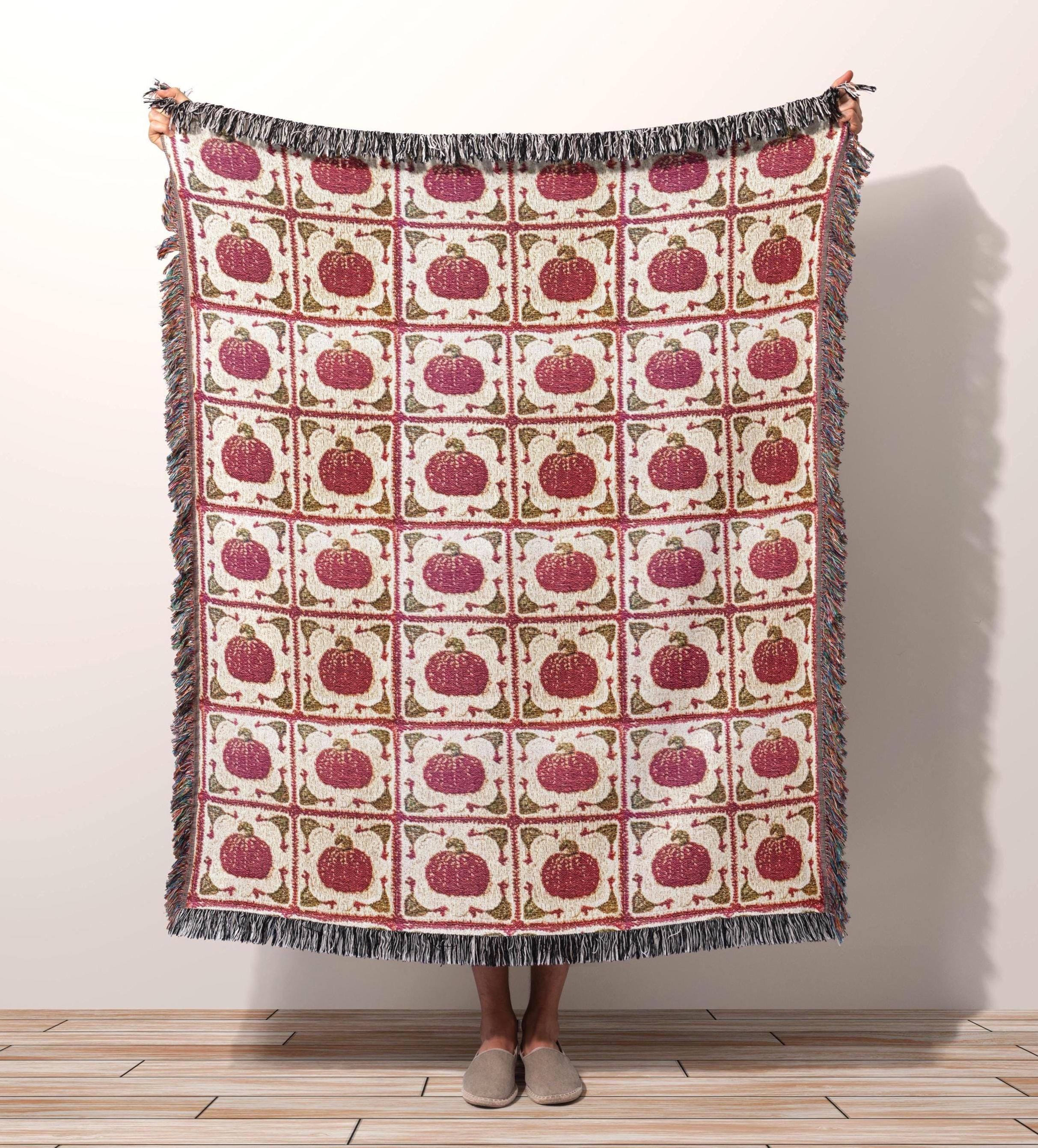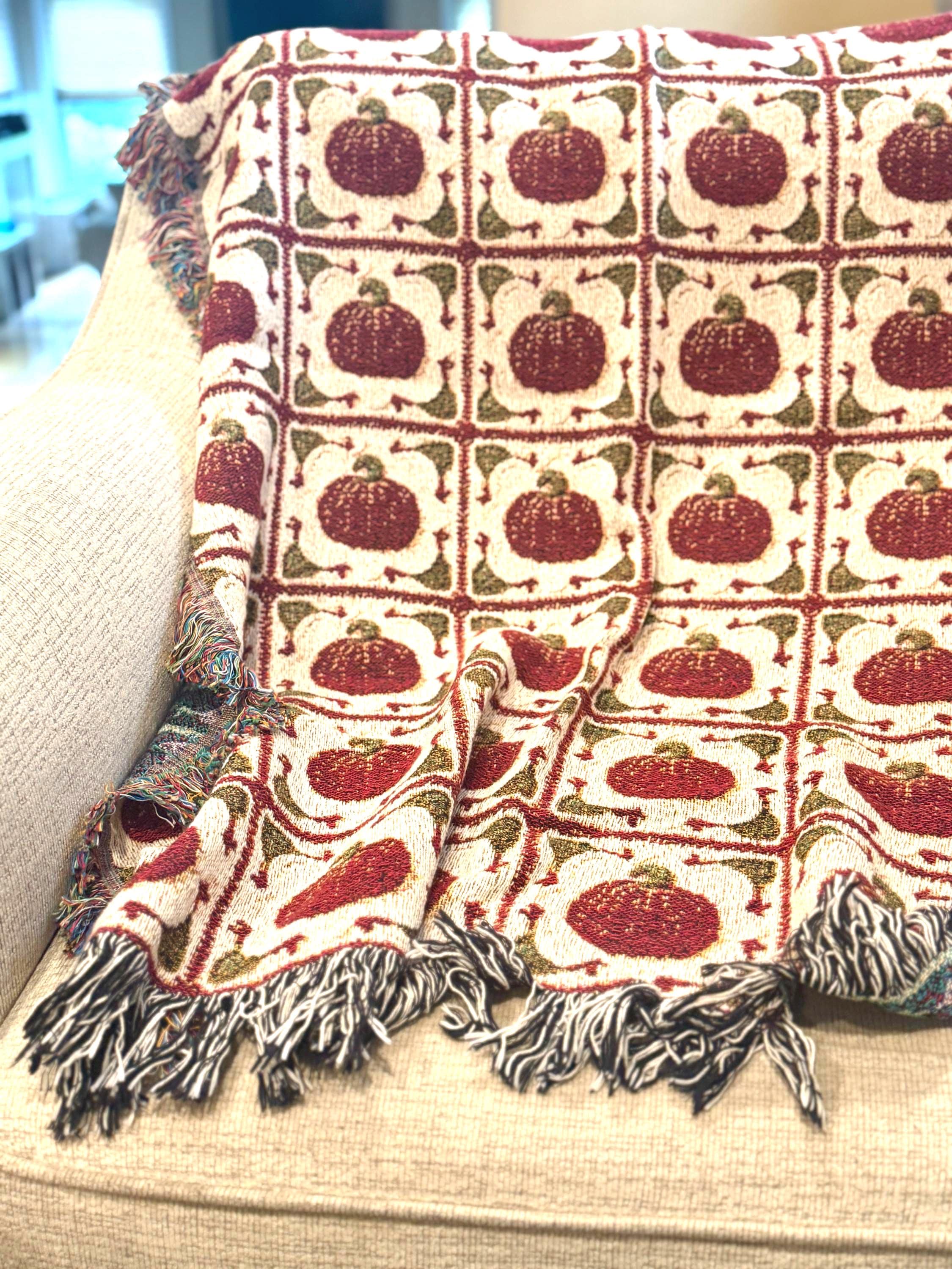 Each blanket features a grid of pumpkin motifs, woven directly into soft cotton threads for rich texture and lasting color. With its vintage tapestry look and multicolor fringe trim, it’s an instant upgrade for your couch, reading chair, or guest room.