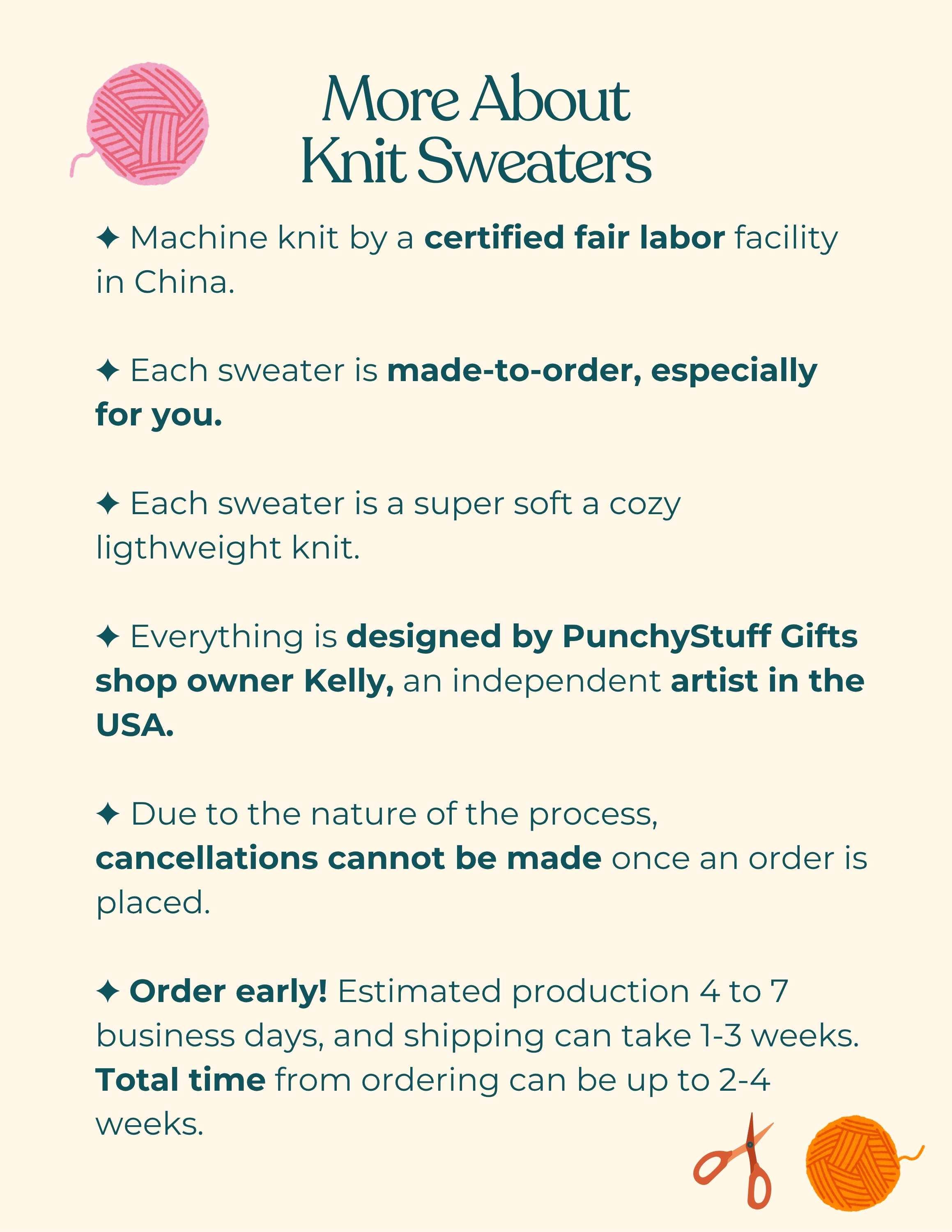 ✦ Each sweater is made-to-order, just for you, in about 4-7 business days. Check the listing details for the current delivery timeline.