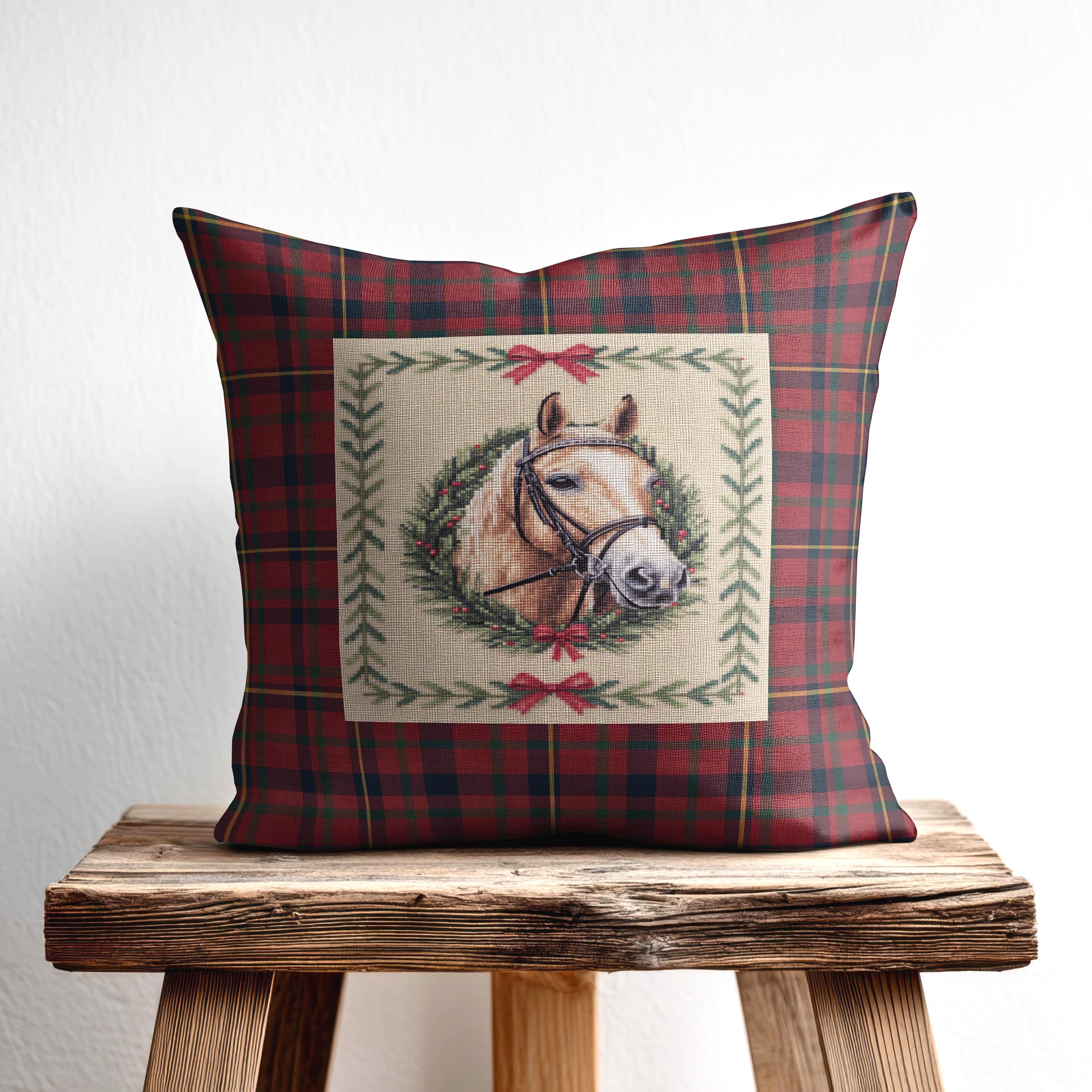 Bring timeless equestrian charm to your holiday home with this Horse Wreath Christmas Pillow — a cozy nod to classic country club style and old money holiday decor. Featuring a beautifully detailed horse framed by a festive wreath and red bows, set against a rich tartan plaid background, this pillow blends traditional craftsmanship with modern comfort.