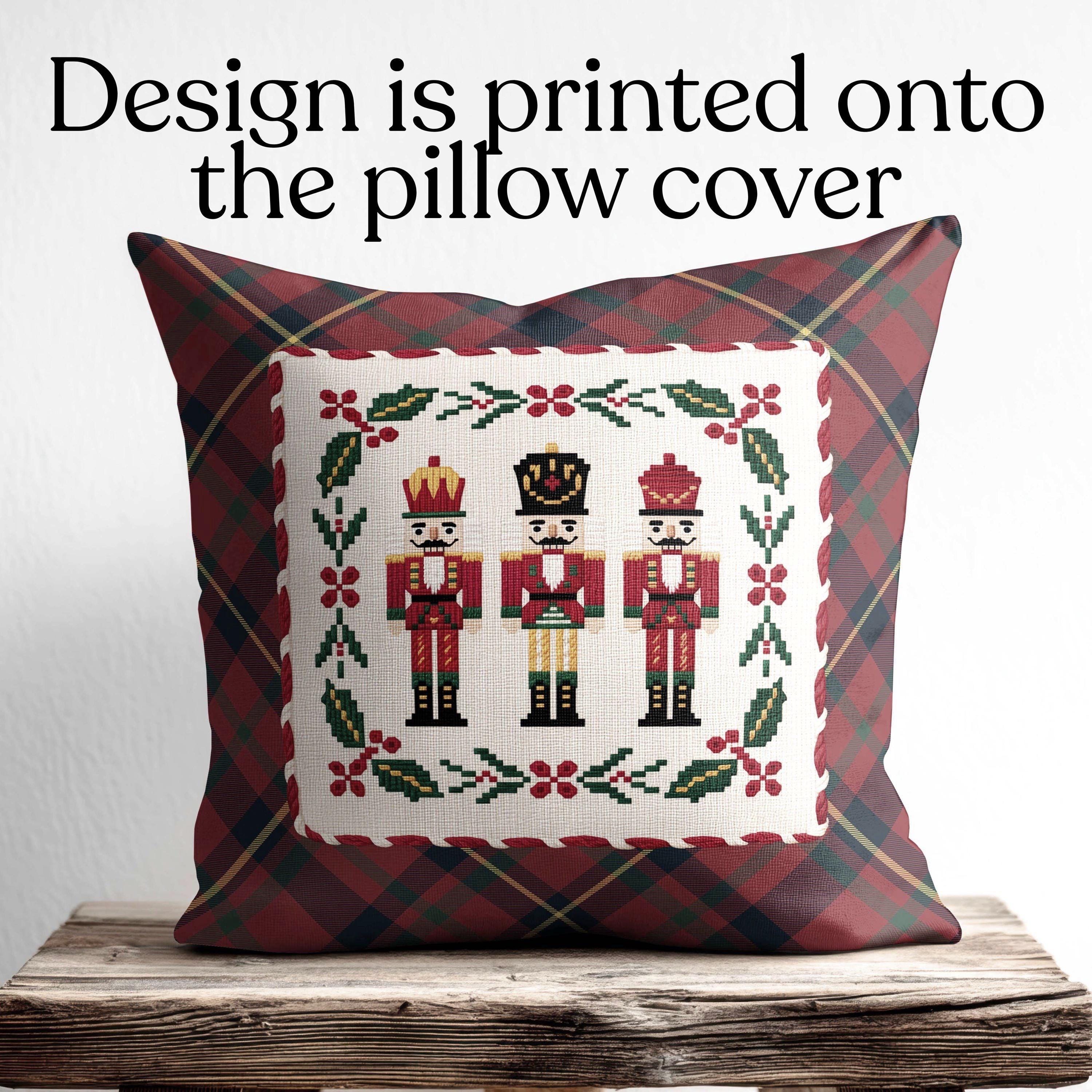Bring a touch of old-world holiday charm home with this double-sided Christmas pillow, featuring a detailed nutcracker cross-stitch print (not stitch) framed by holly and berries. The back showcases a deep red and green tartan plaid that pairs beautifully with your festive decor.