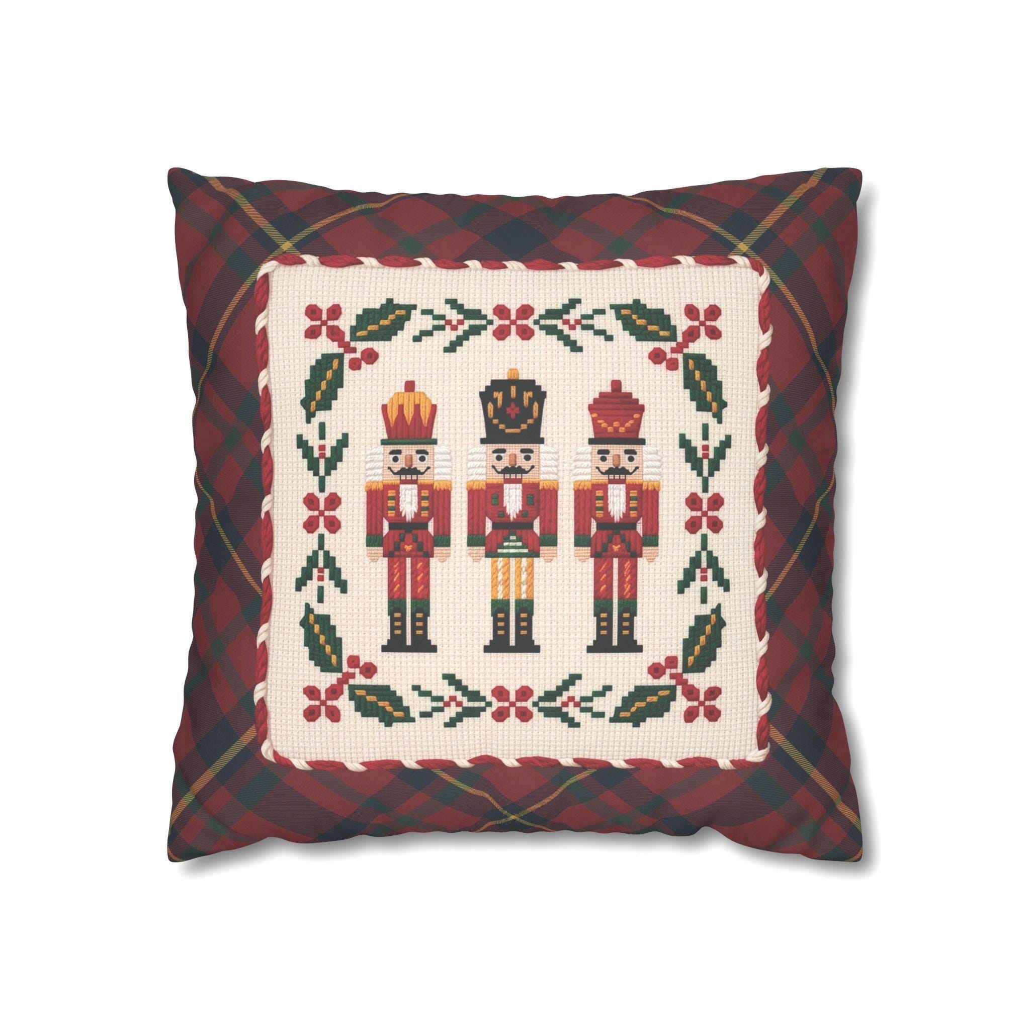 Classic Christmas plaid pillow with faux embroidered nutcracker design — double-sided holiday cushion in rich tartan and cozy faux suede for timeless, preppy Christmas decor.