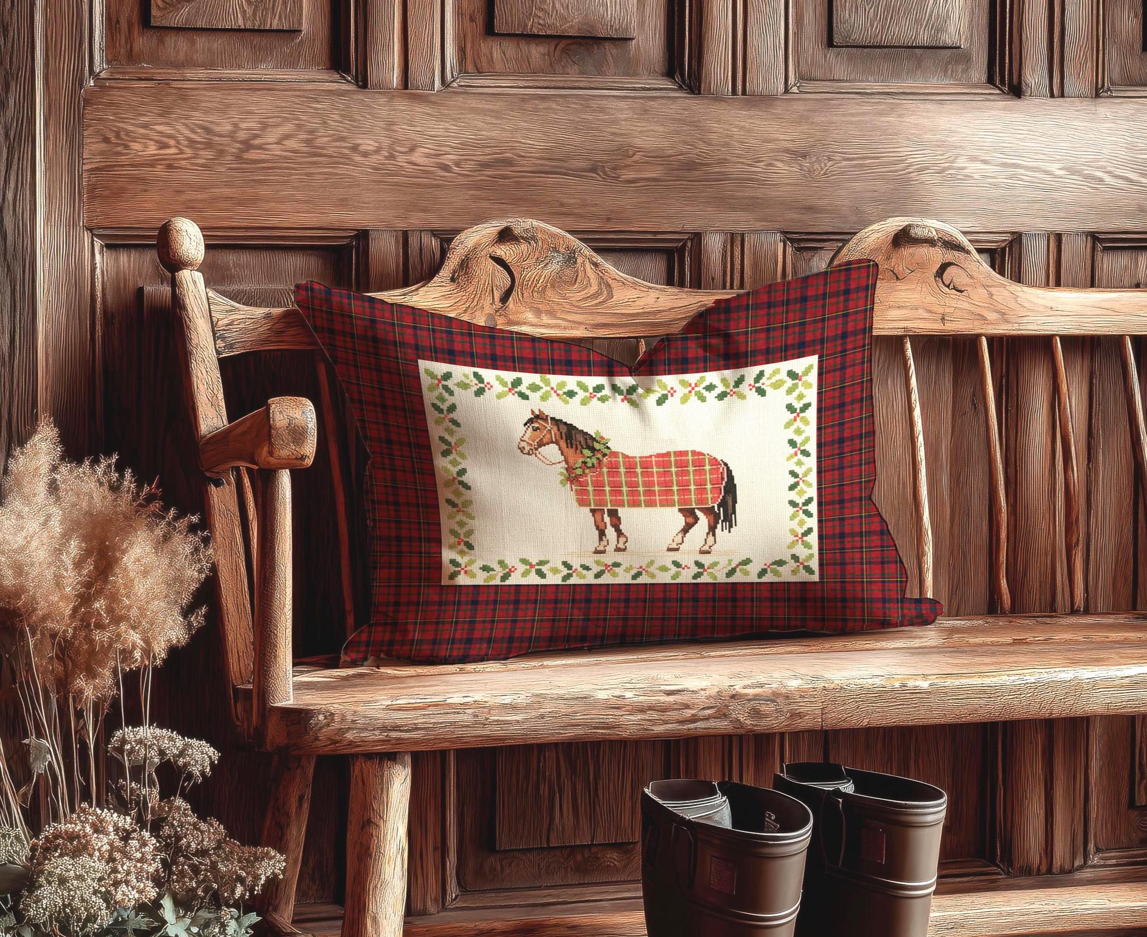 Bring classic equestrian charm to your holiday home with this plaid horse lumbar pillow, inspired by cozy country lodges and traditional Christmas style. This double-sided accent pillow features a horse in a festive tartan blanket framed with holly and ivy, set against a warm plaid border. Perfect for farmhouse, cottage, or “old-money” holiday décor—it looks just as good in a mudroom bench as it does on a fireside armchair.