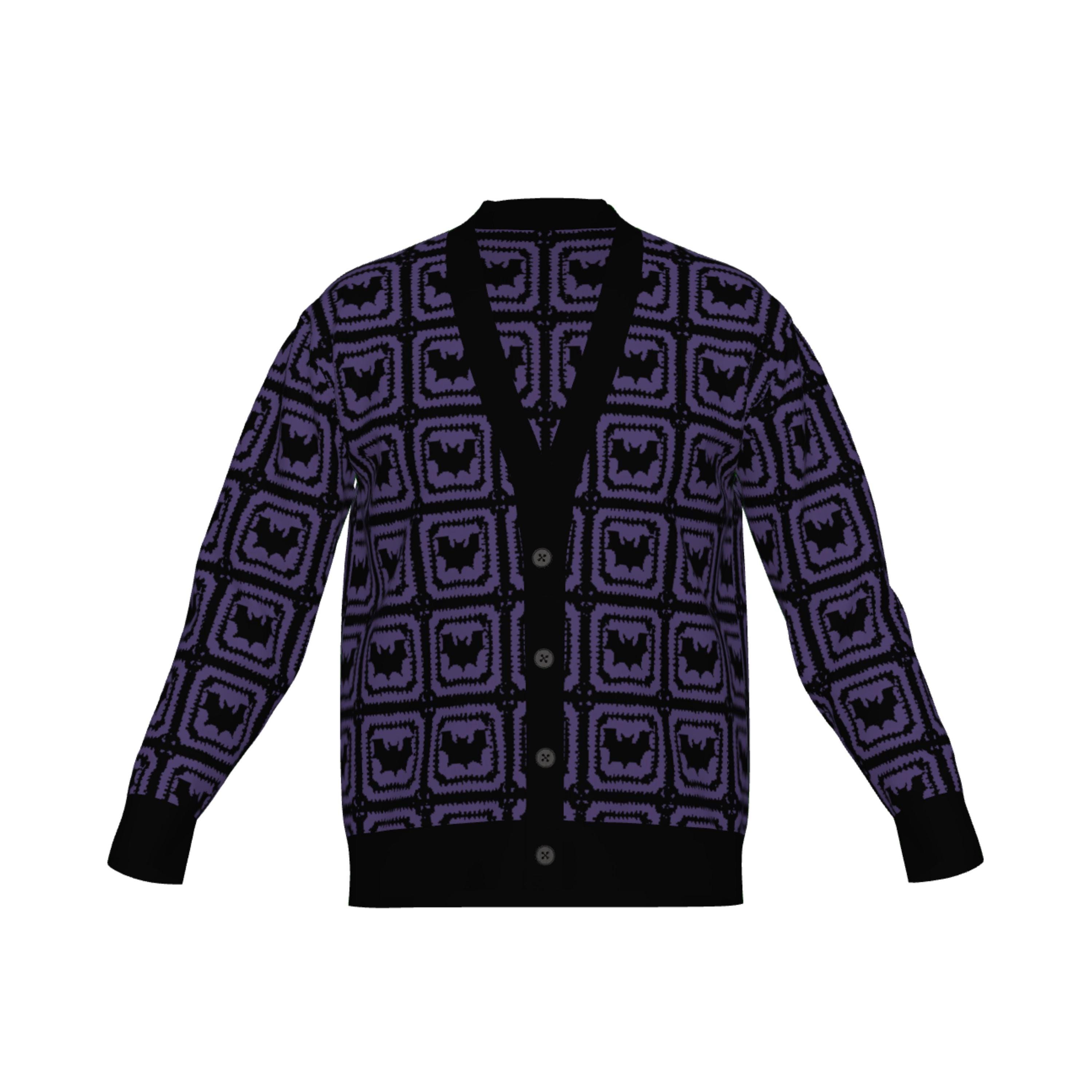 This granny square cardigan features bat silhouettes in each square, creating a spooky-cute piece that celebrates the darker side of nature in vintage crochet-looking style.