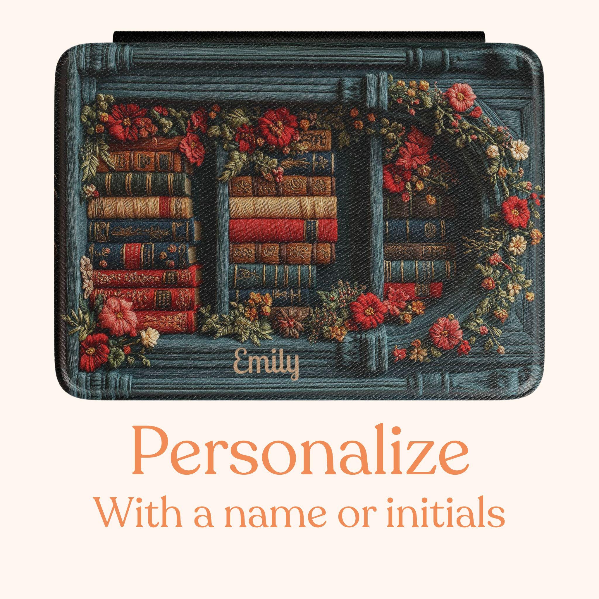 Personalized Dark Academia Kindle Case - Floral Bookshelf Design - Fits Kindle Paperwhite 7", Signature Edition & Colorsoft (2024-2026) - Personalized Book Lover Gift