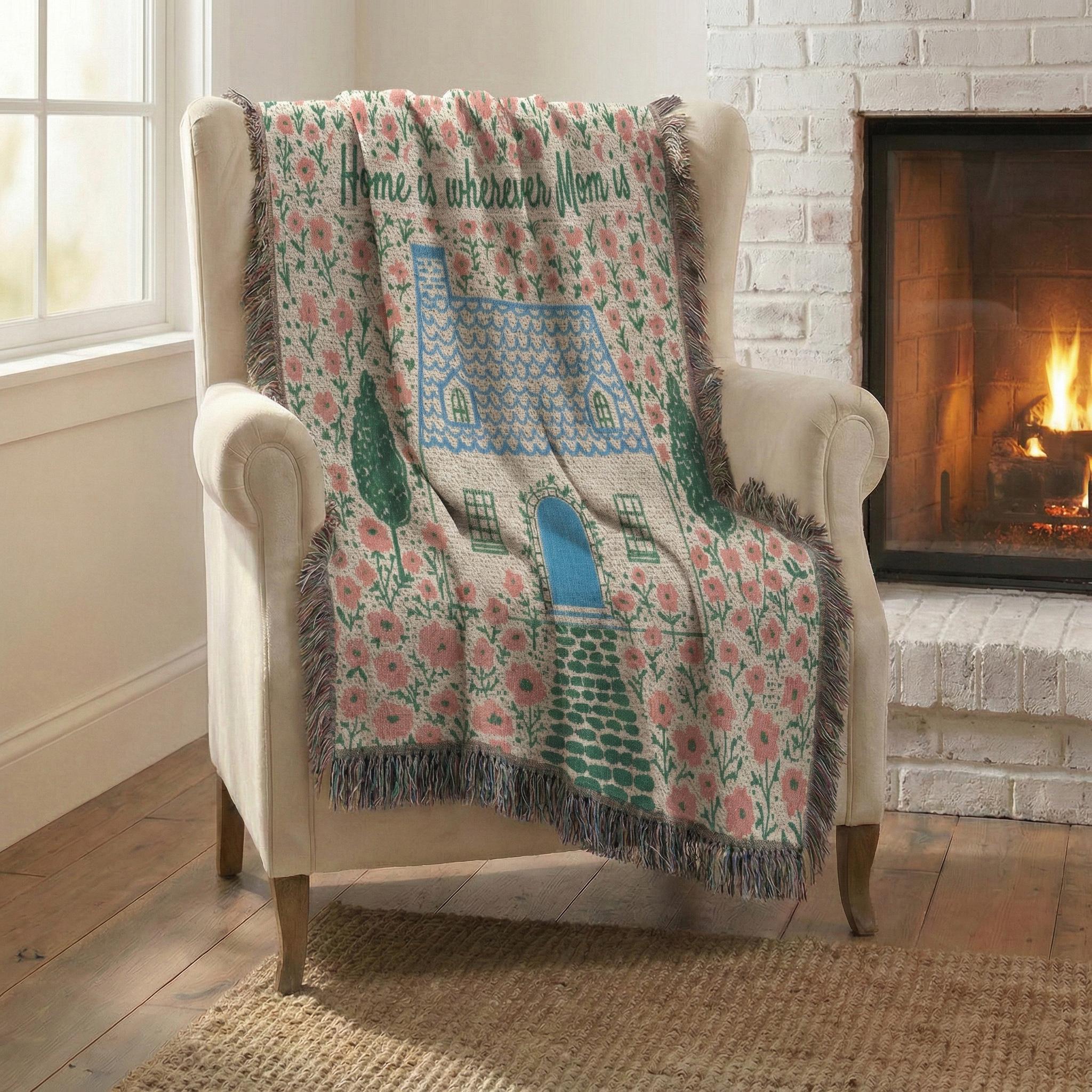 A hand illustrated (by me!), US-woven 100% cotton throw blanket featuring an original cottage garden folk art illustration with the phrase "Home is wherever Mom is", personalizable with any name or title. A thoughtful, heirloom-quality gift for Mother's Day, birthdays, or just because.