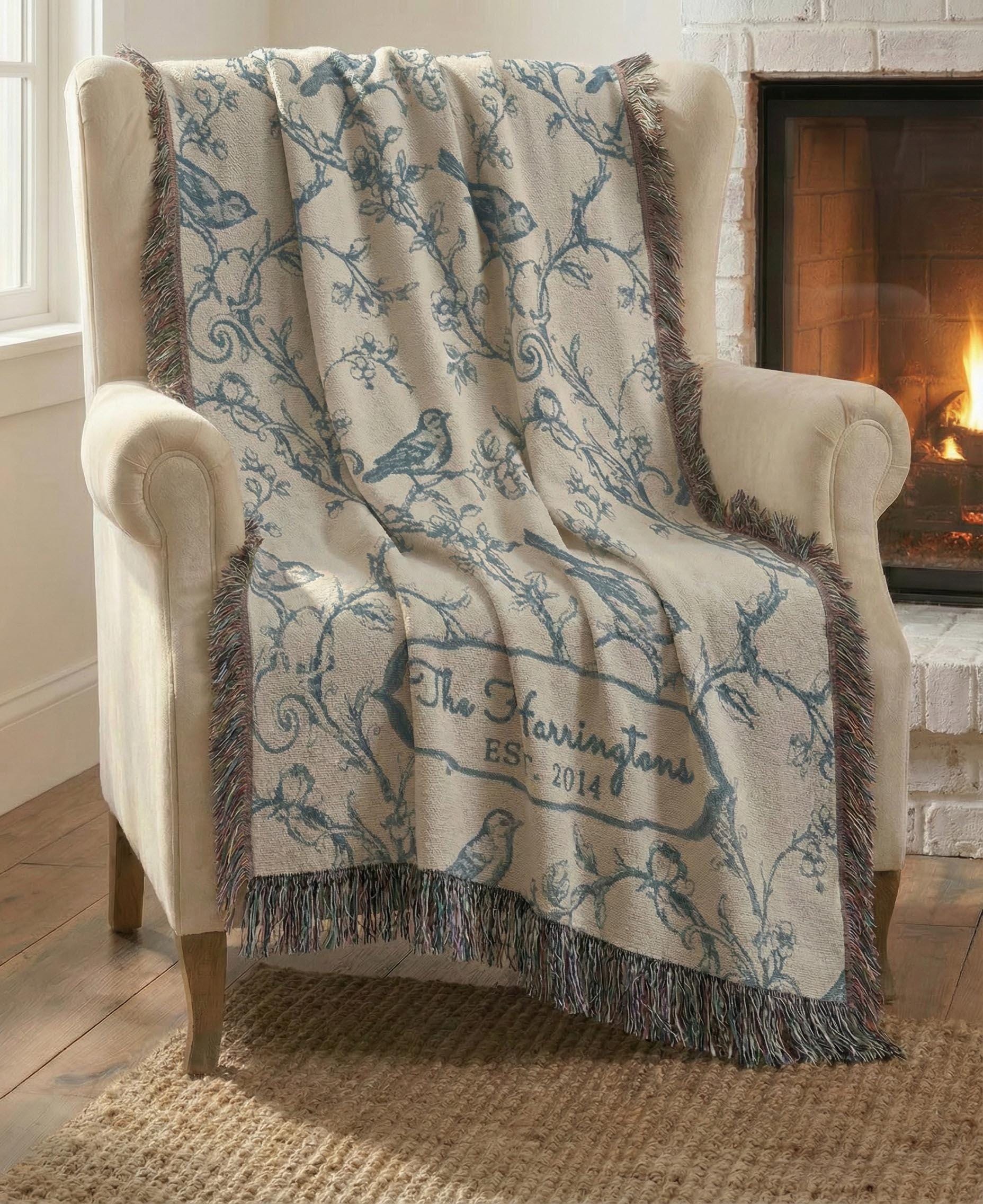 Personalized Chinoiserie Bird Woven Blanket | Custom Family Name Toile Throw | Anniversary Wedding Gift, Mother's Day Gift Cotton Home Decor