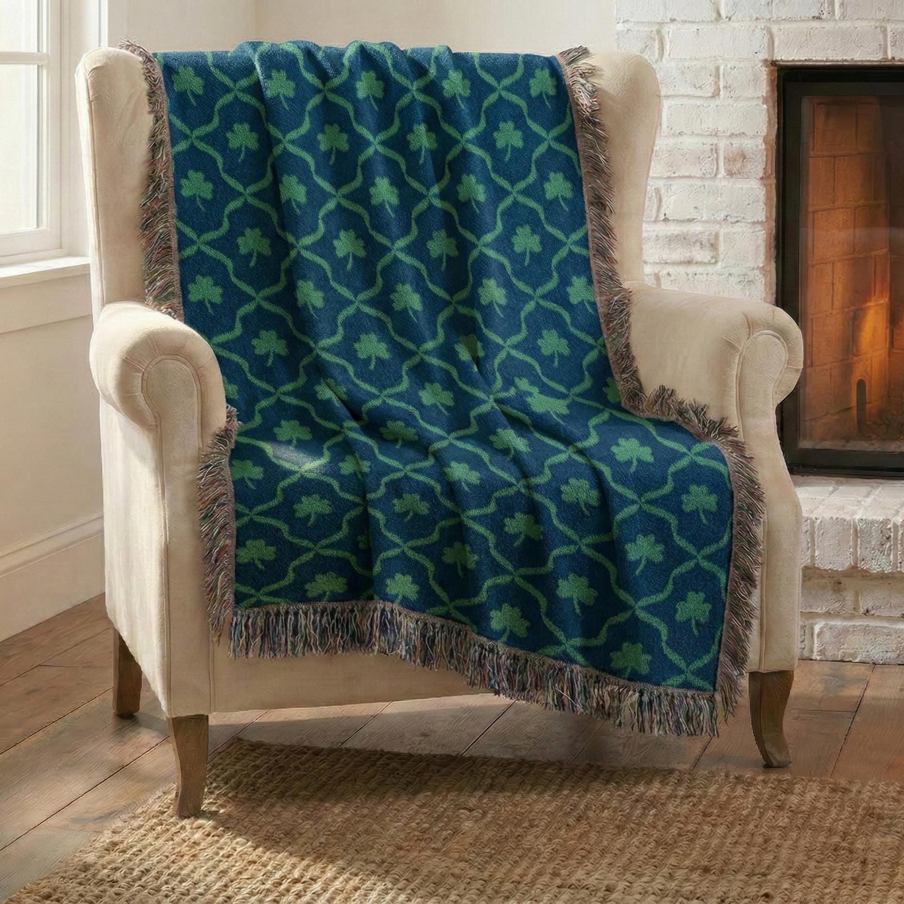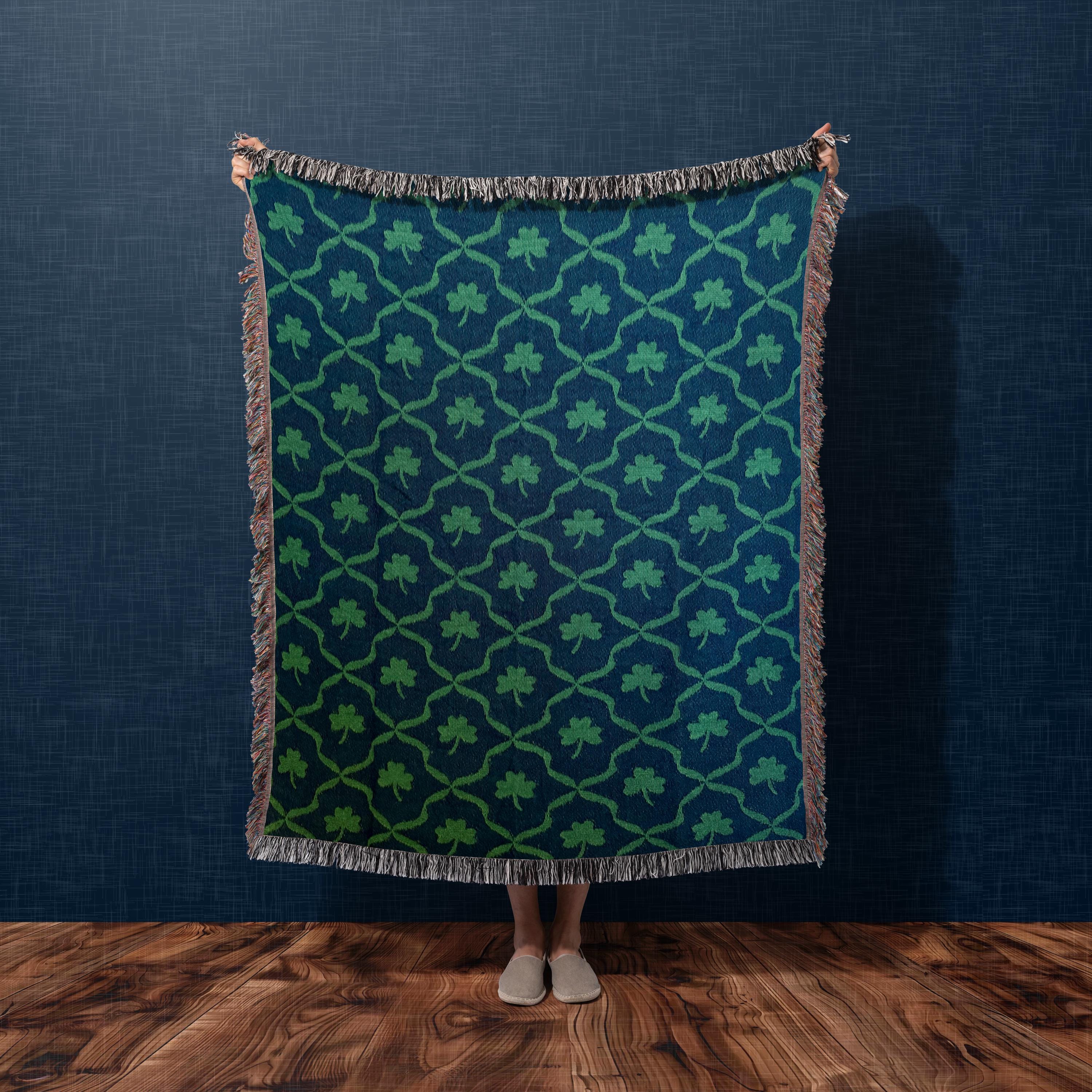 Shamrock lattice woven throw blanket in deep blue and green, an heirloom-quality Irish gift designed by Kelly in Chicago and woven from 100% cotton by our US textile partner. Three sizes available for chairs, couches, and beds.