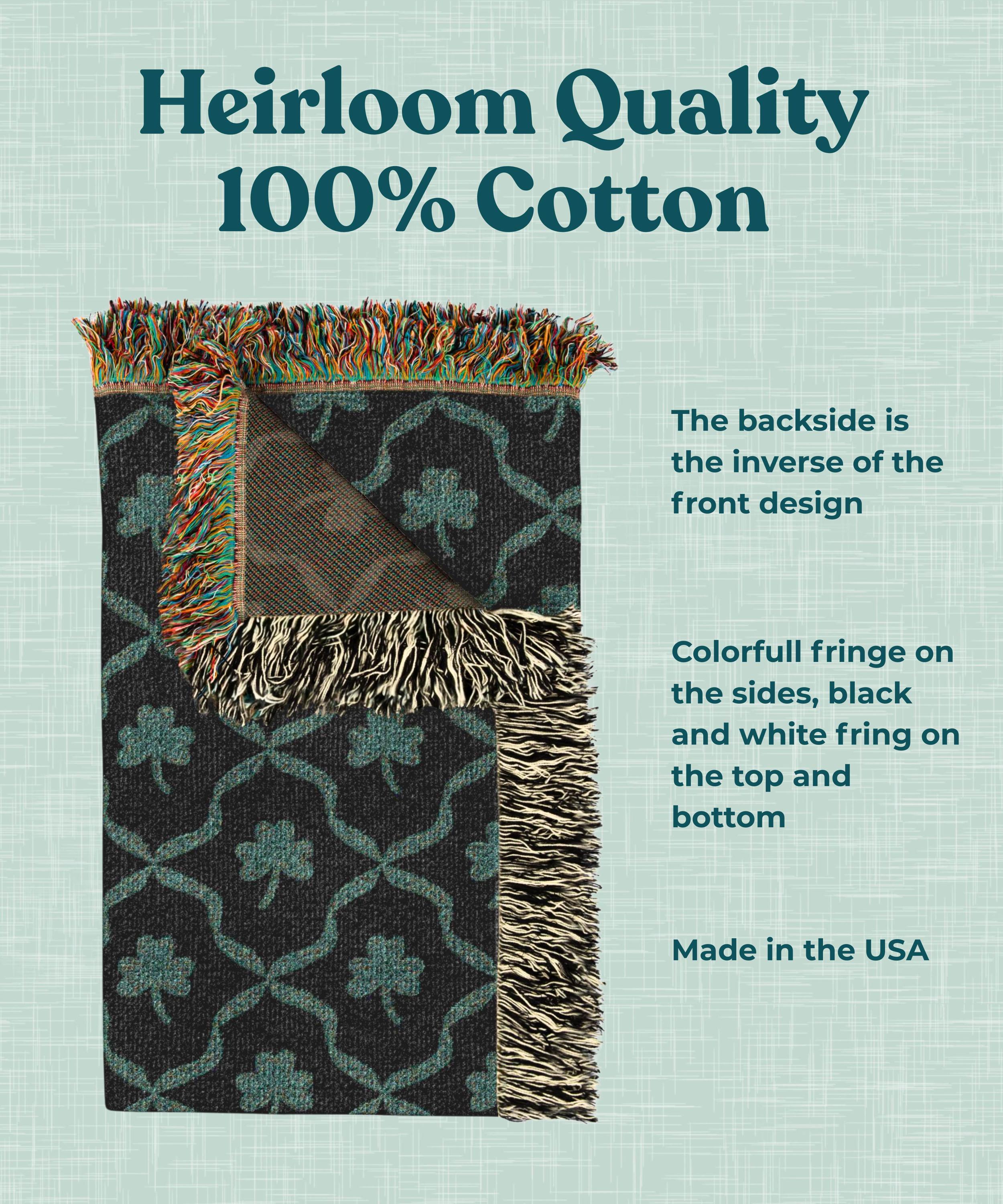 This is not a printed fleece or a mass-produced import. Each blanket is jacquard-woven in the United States from 100% cotton, giving it real weight, texture, and a beautiful drape that gets softer with every wash. The shamrock and lattice design is woven directly into the fabric — visible on both sides, with the backside showing a striking inverse of the front pattern.