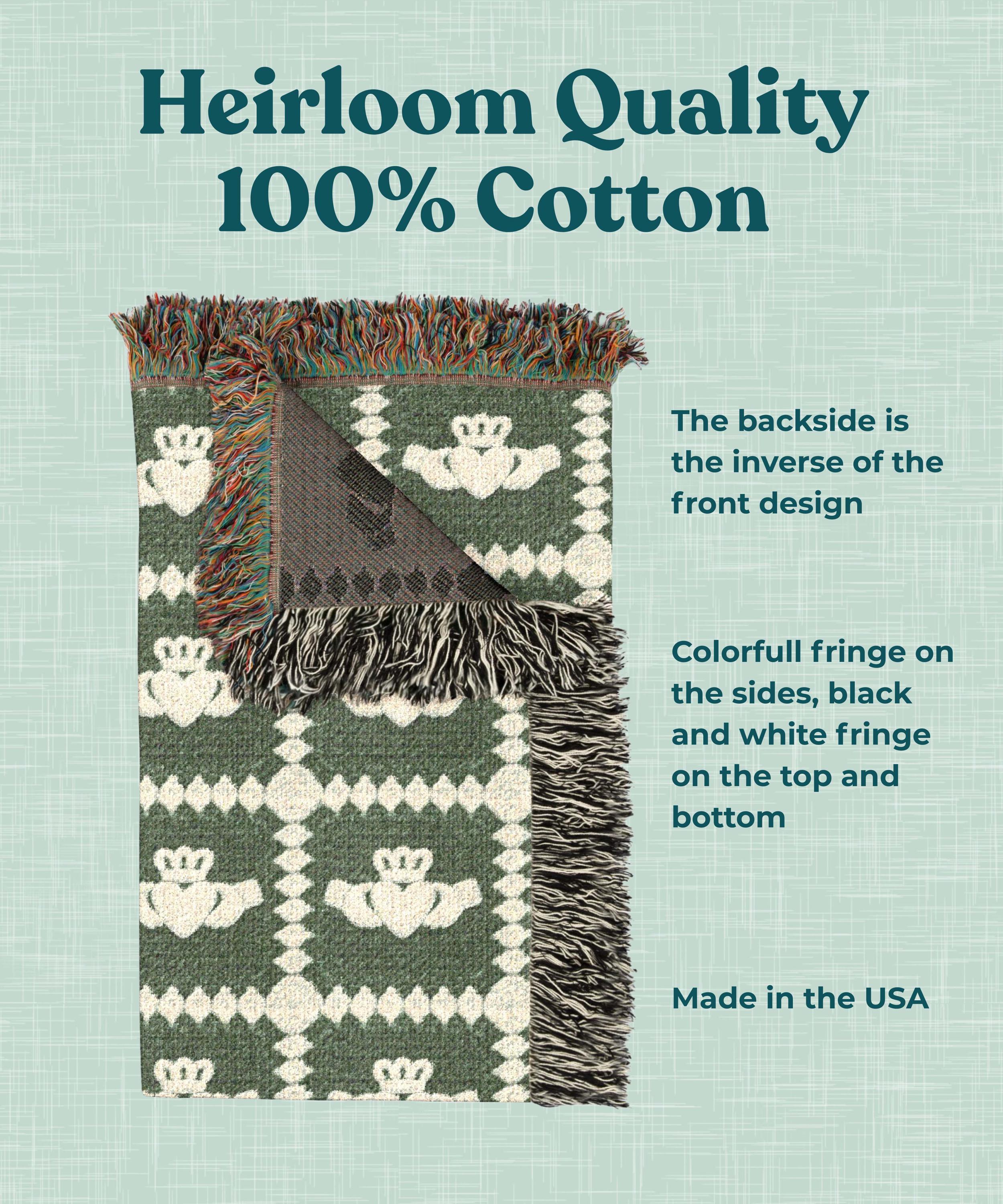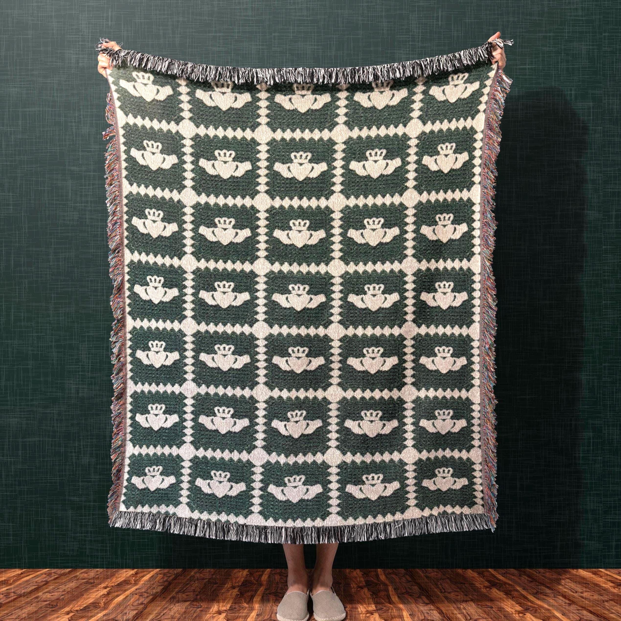 The Claddagh is one of Ireland's oldest and most meaningful symbols: two hands holding a crowned heart, representing friendship, love, and loyalty. This isn't clip art on a cheap fleece — each Claddagh motif is jacquard-woven into the blanket itself, front and back, in deep hunter green and natural cream.