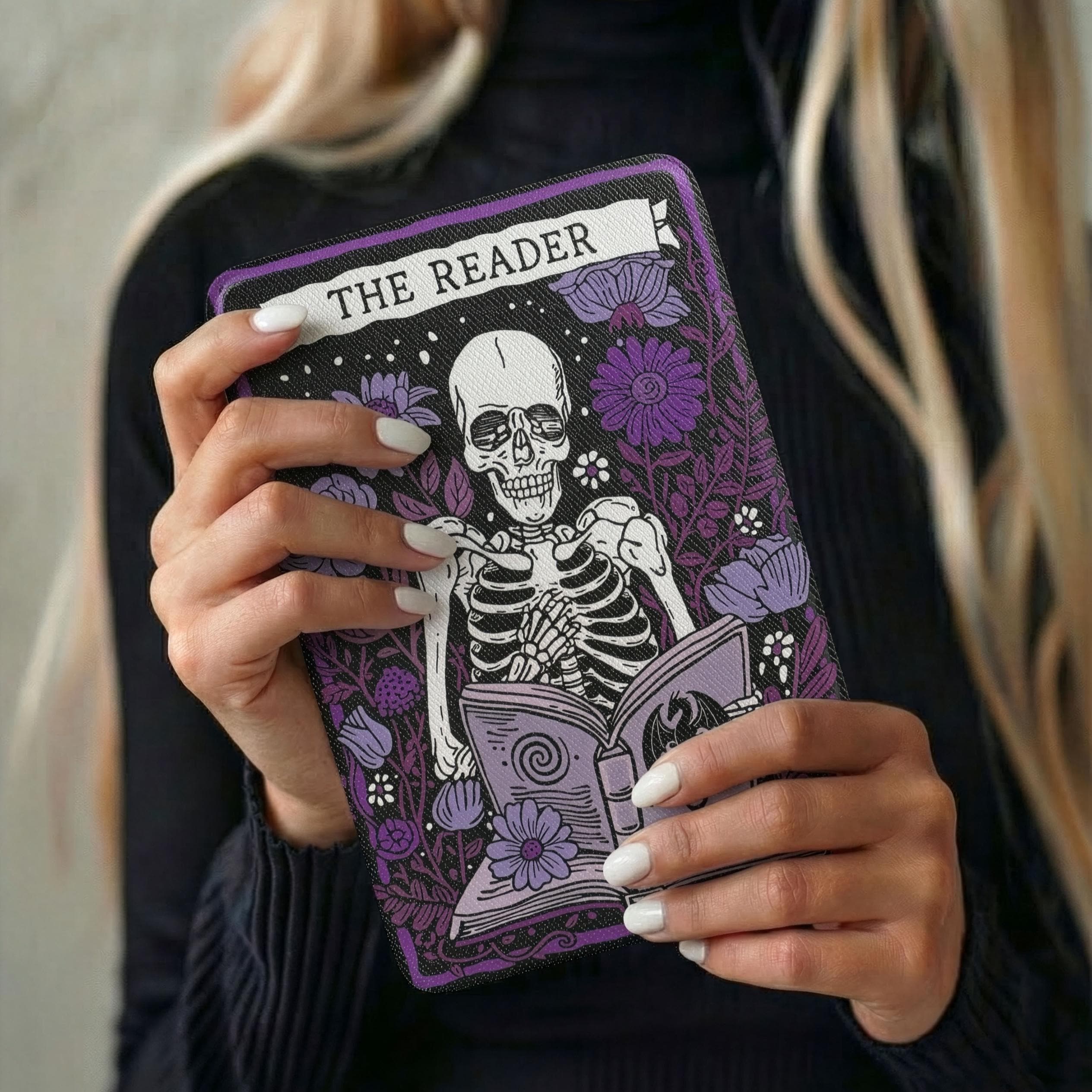 "The Reader" a tarot card-style Kindle cover for the person whose TBR pile is a personality trait. This PU leather case features a grinning skeleton surrounded by botanical florals, reading an open spellbook, framed in a banner-top tarot card design. It is equal parts dark academia, witchy bookshelf aesthetic, and BookTok obsession, and it looks stunning on a Kindle.