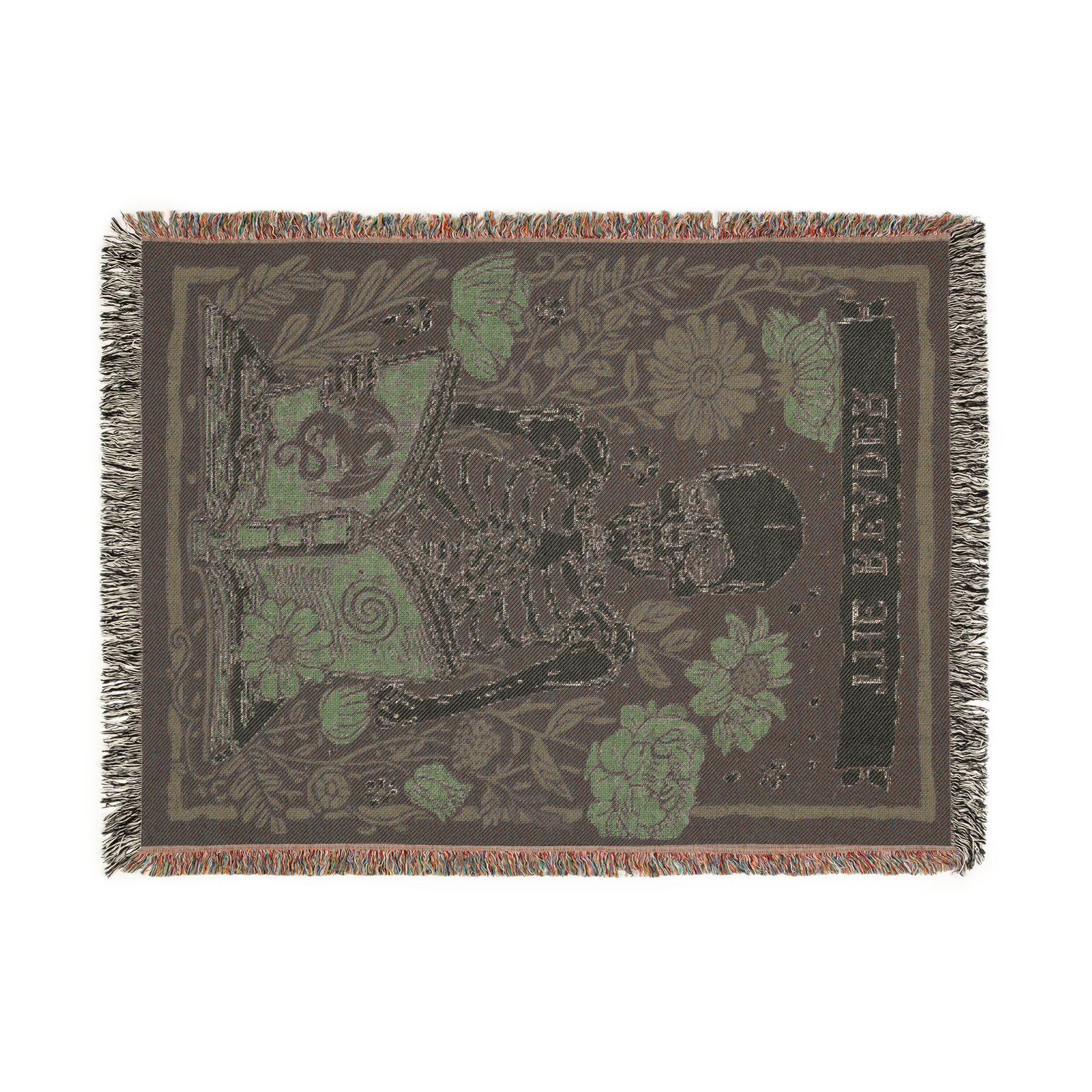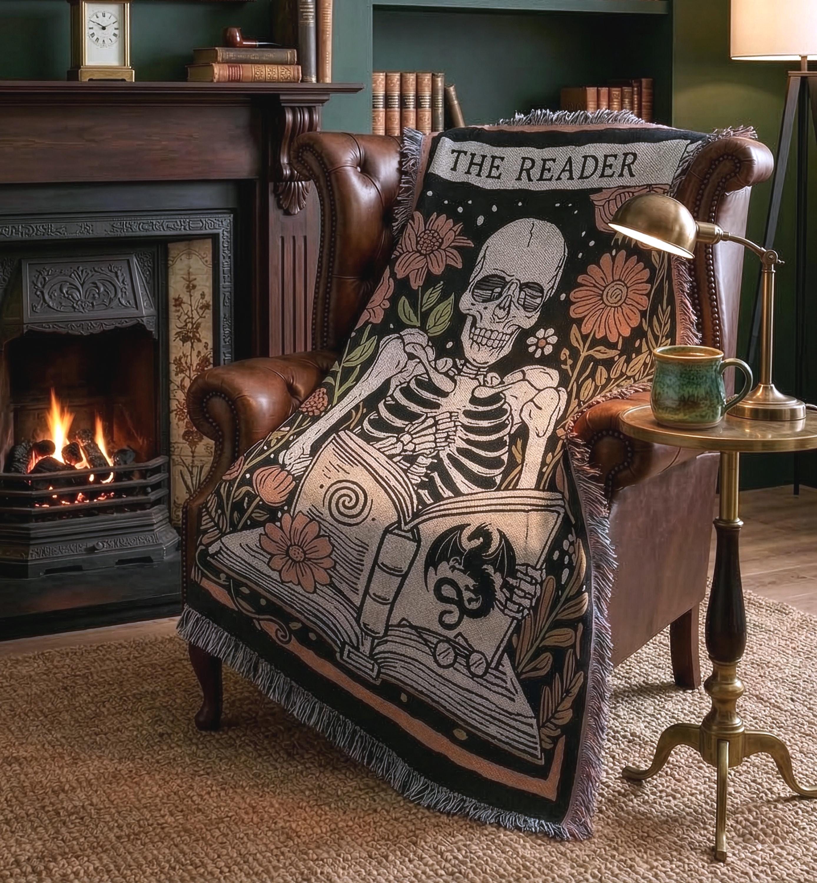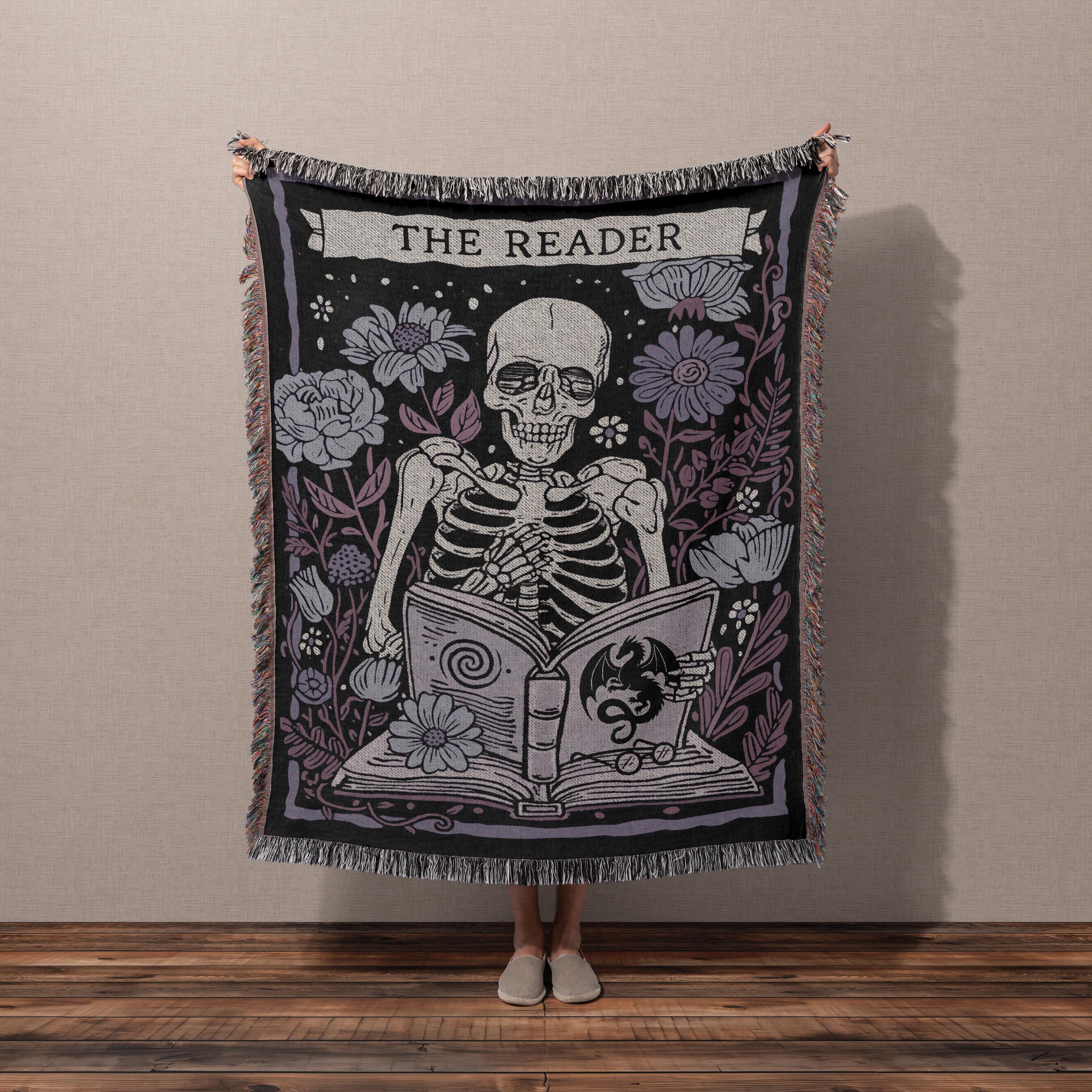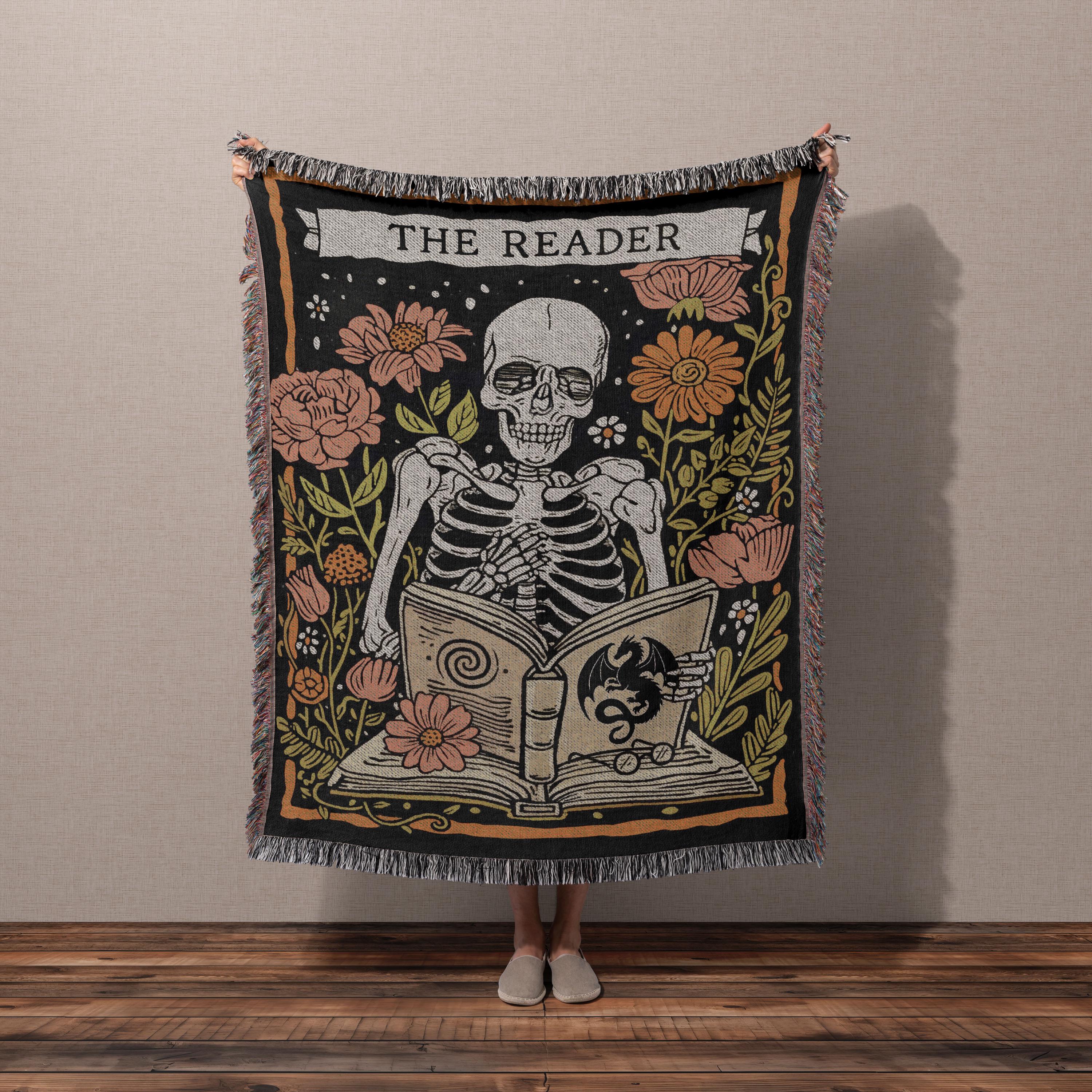 Designed in Chicago and woven in the USA from 100% cotton — not printed, not mass-produced. The skeleton, florals, and THE READER banner are built into the fabric itself, the way blankets used to be made.