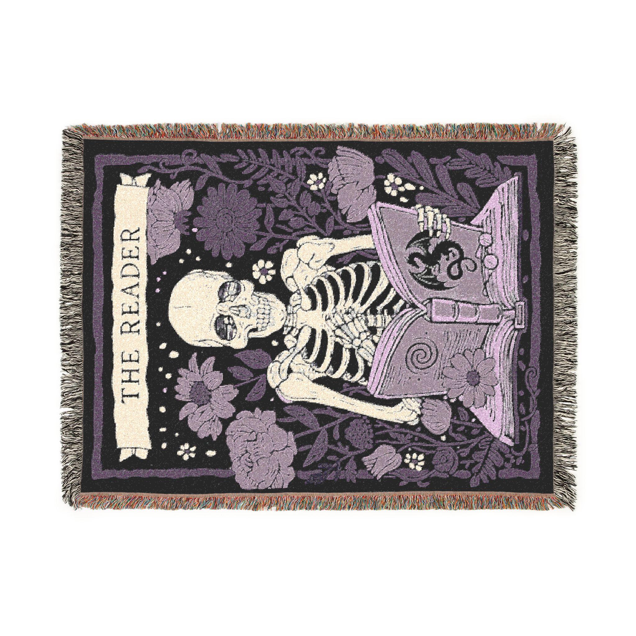 Both colorways feature the same original design: a grinning skeleton absorbed in a spellbook, surrounded by blooms, framed like a tarot card. It's a blanket for someone who would rather be reading.