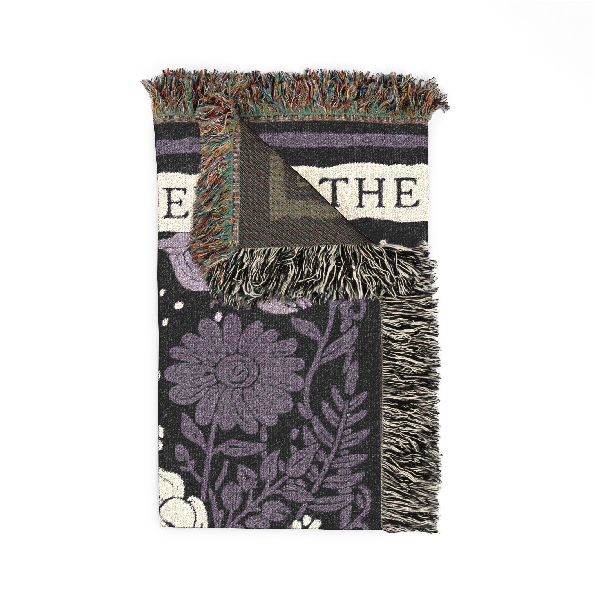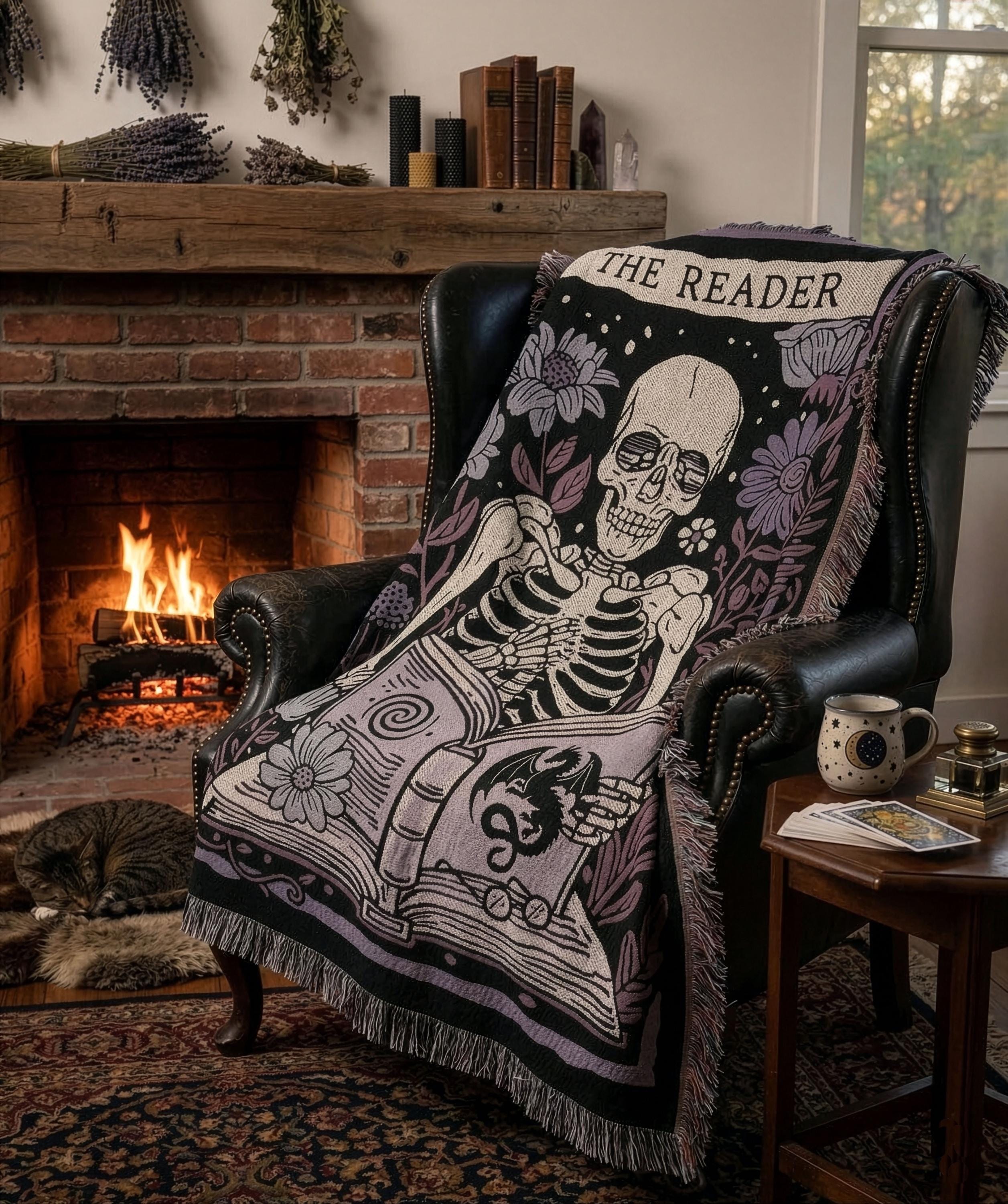 "The Reader", a tarot card-style woven throw blanket for the book lover who considers their reading nook a sacred space.