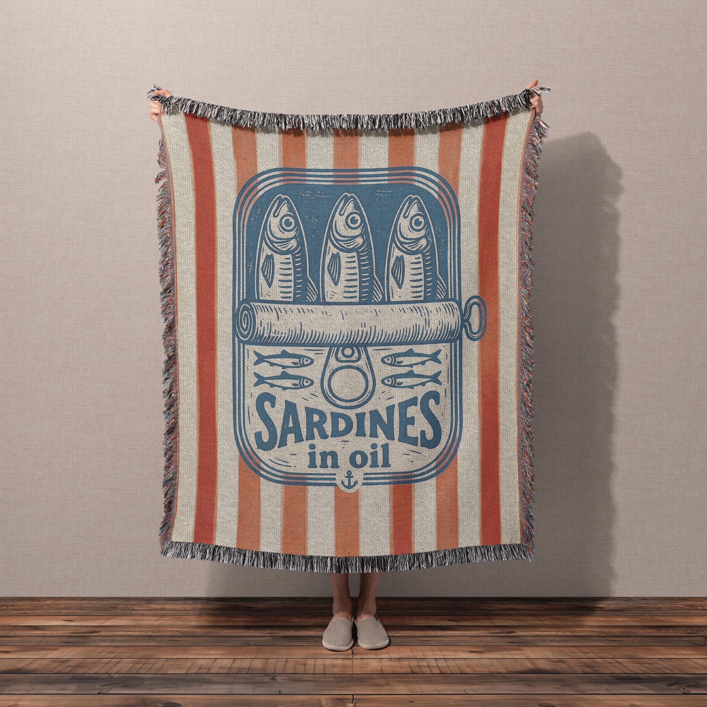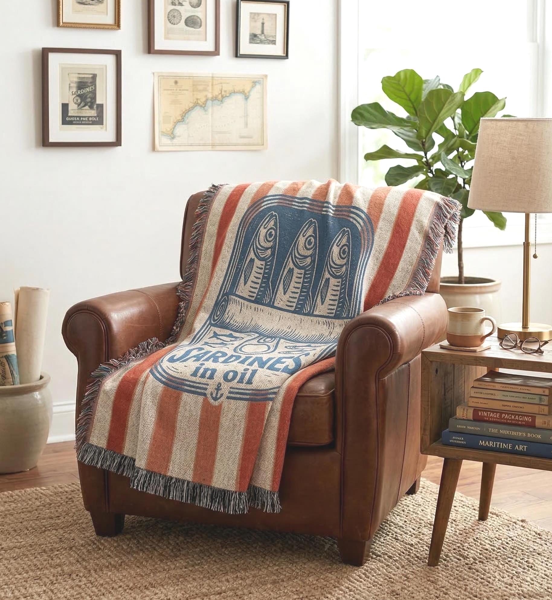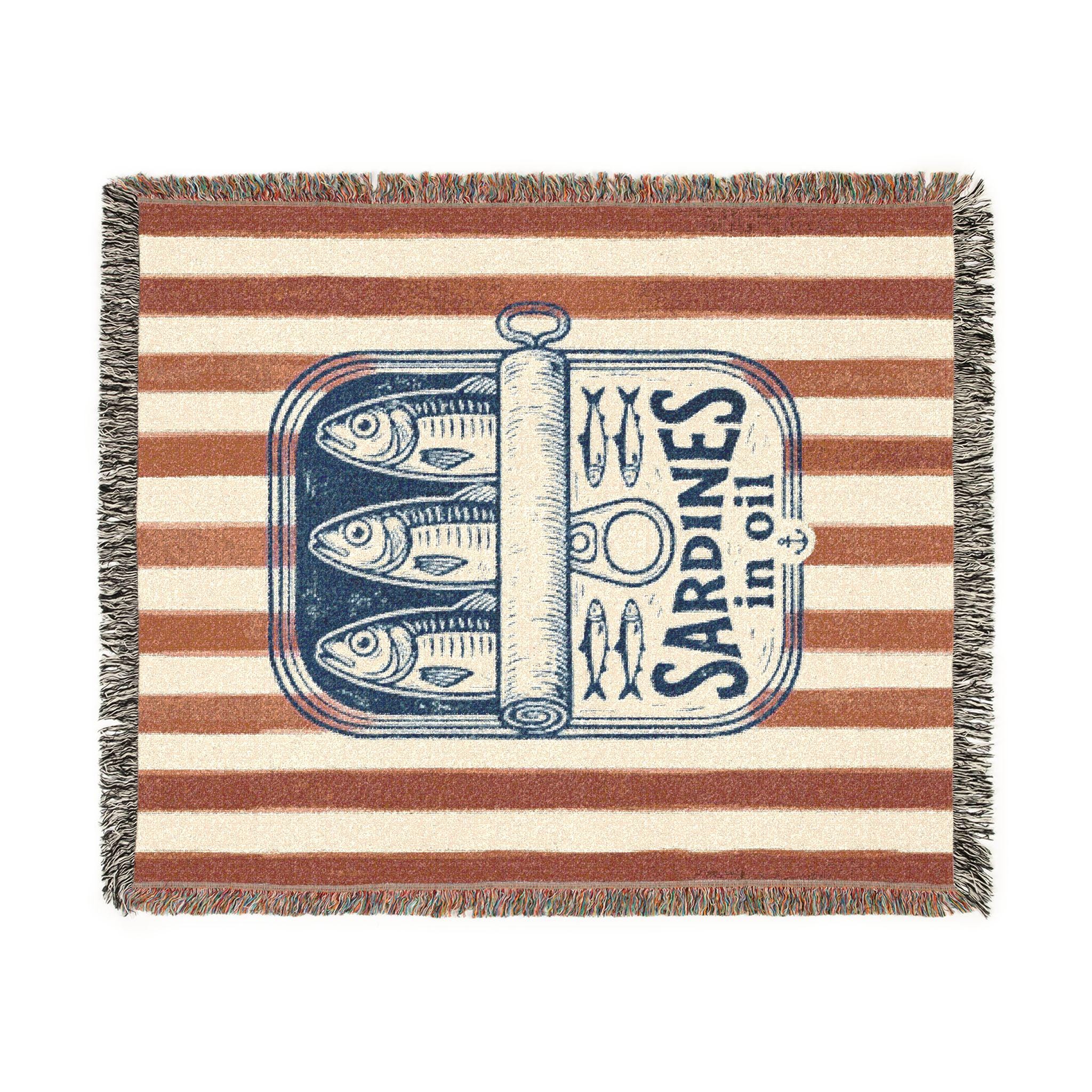 Sardines in Oil — a vintage linocut-style woven throw blanket for the person whose home looks like a coastal antique shop, in the best possible way.