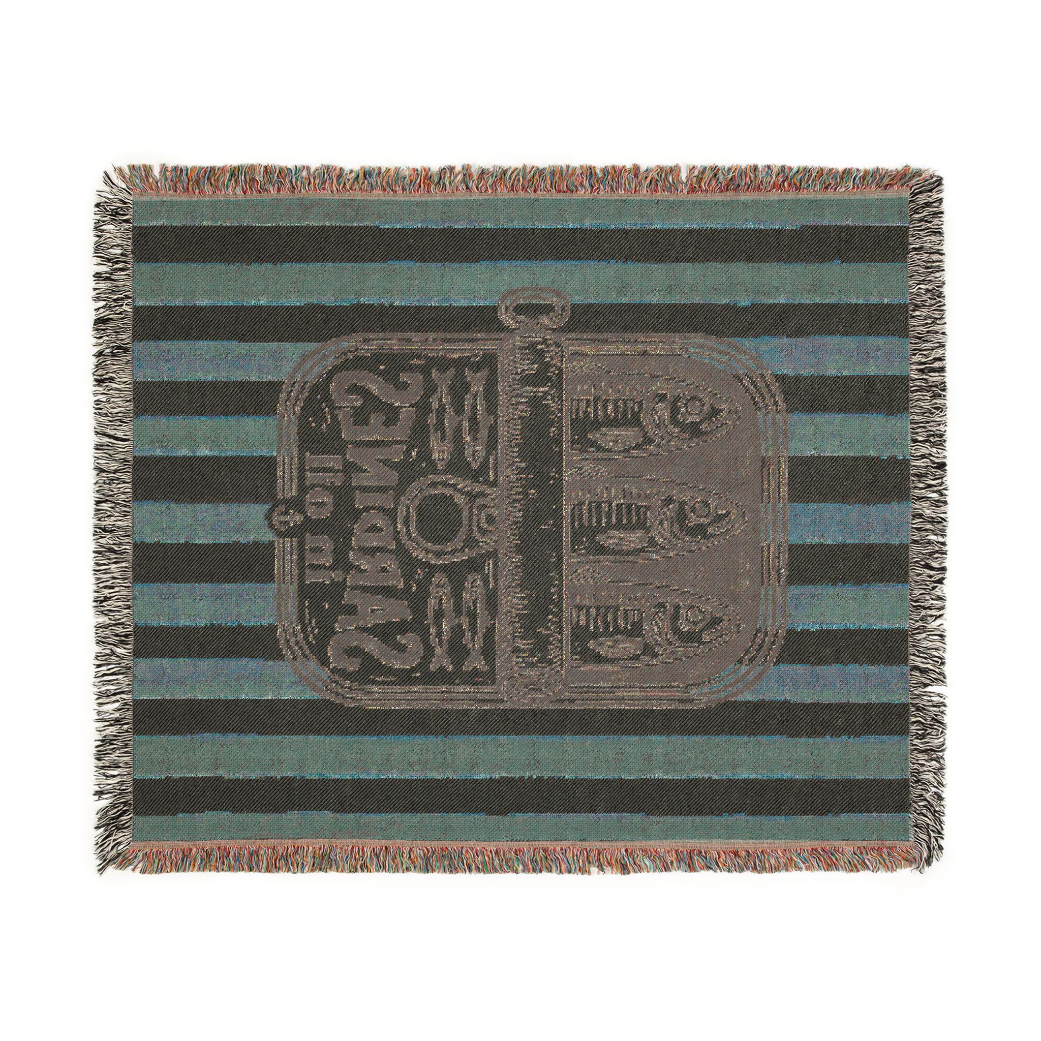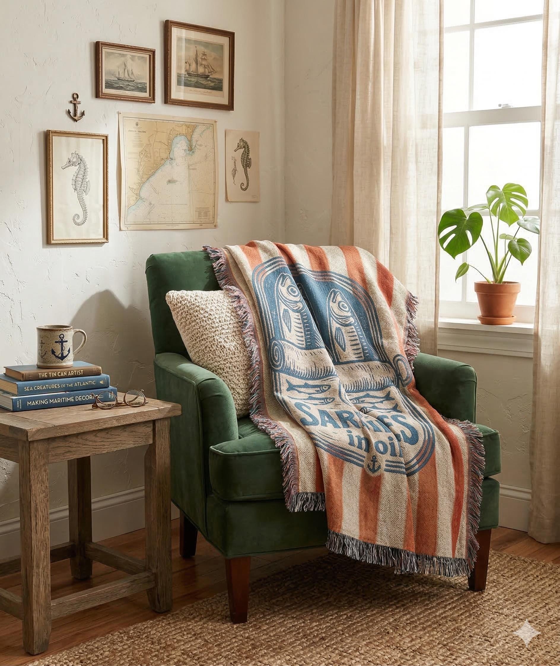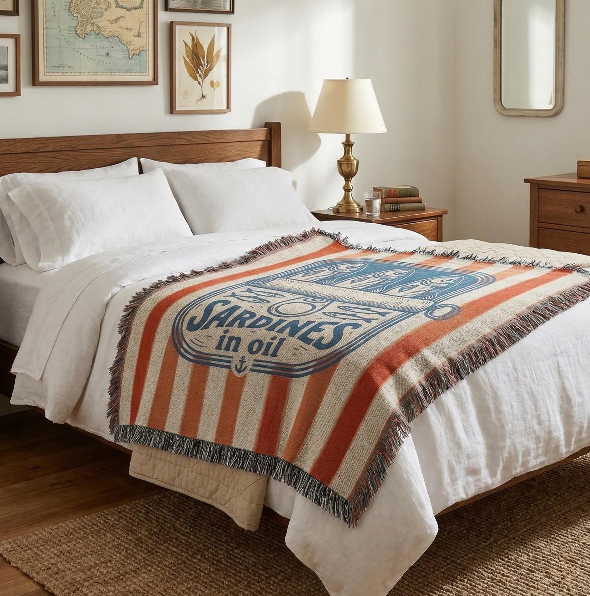 Sardines in Oil — a vintage linocut-style woven throw blanket for the person whose home looks like a coastal antique shop, in the best possible way.
