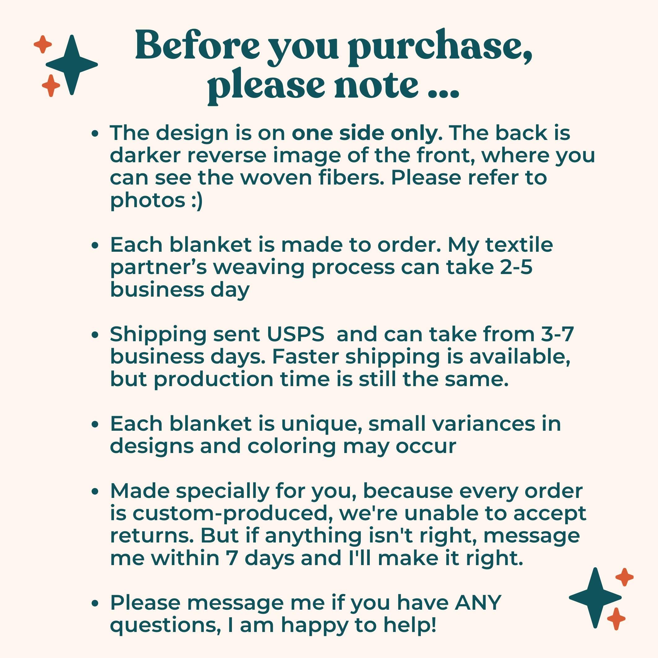 ✦ Each blanket is made-to-order, just for you, in about 3-6 business days. Check the listing details for the current delivery timeline.