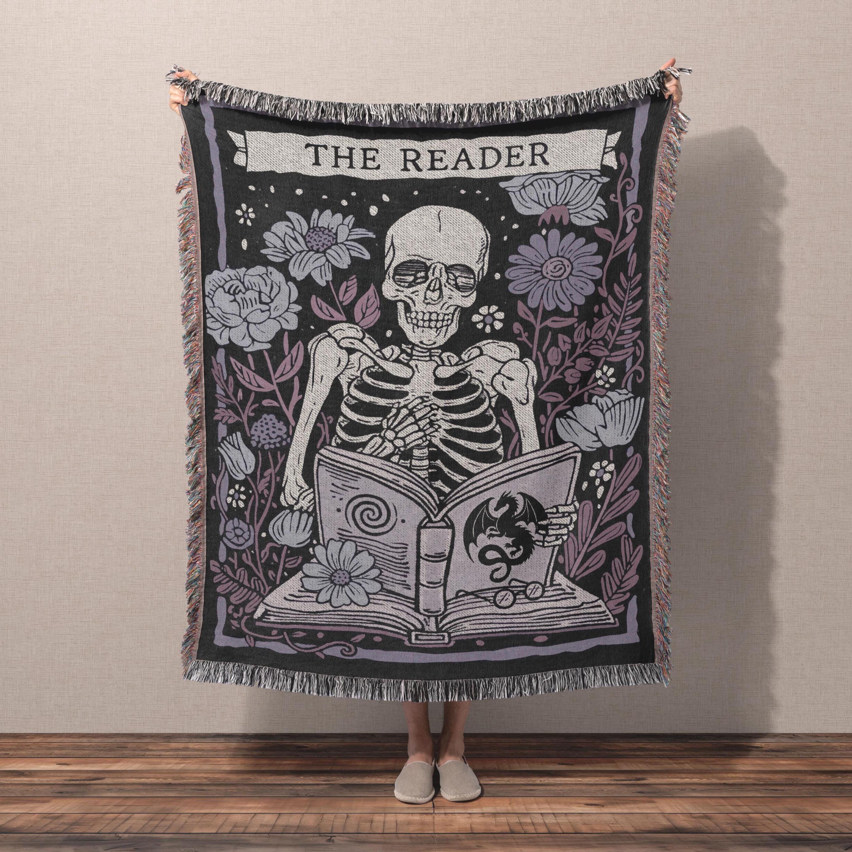 Both colorways feature the same original design: a grinning skeleton absorbed in a spellbook, surrounded by blooms, framed like a tarot card. It's a blanket for someone who would rather be reading.