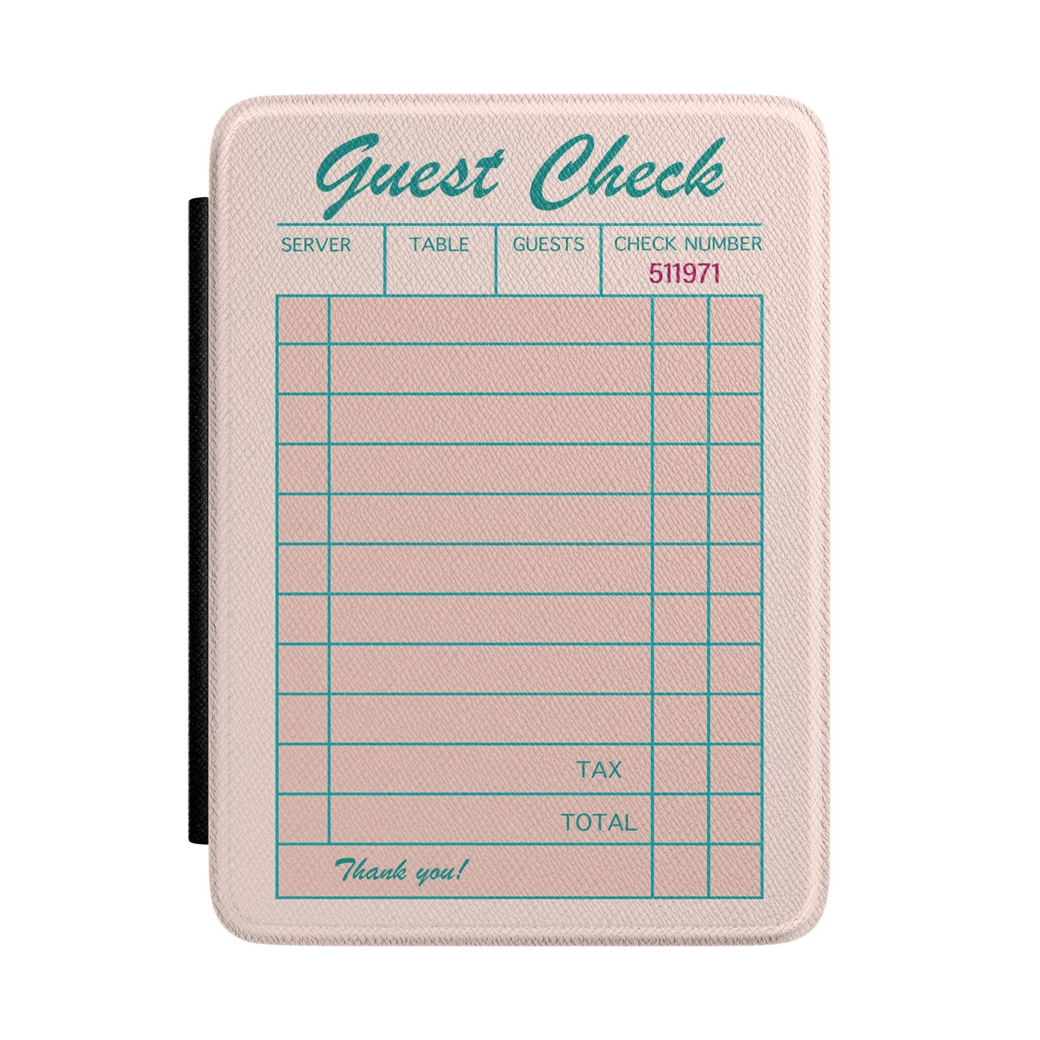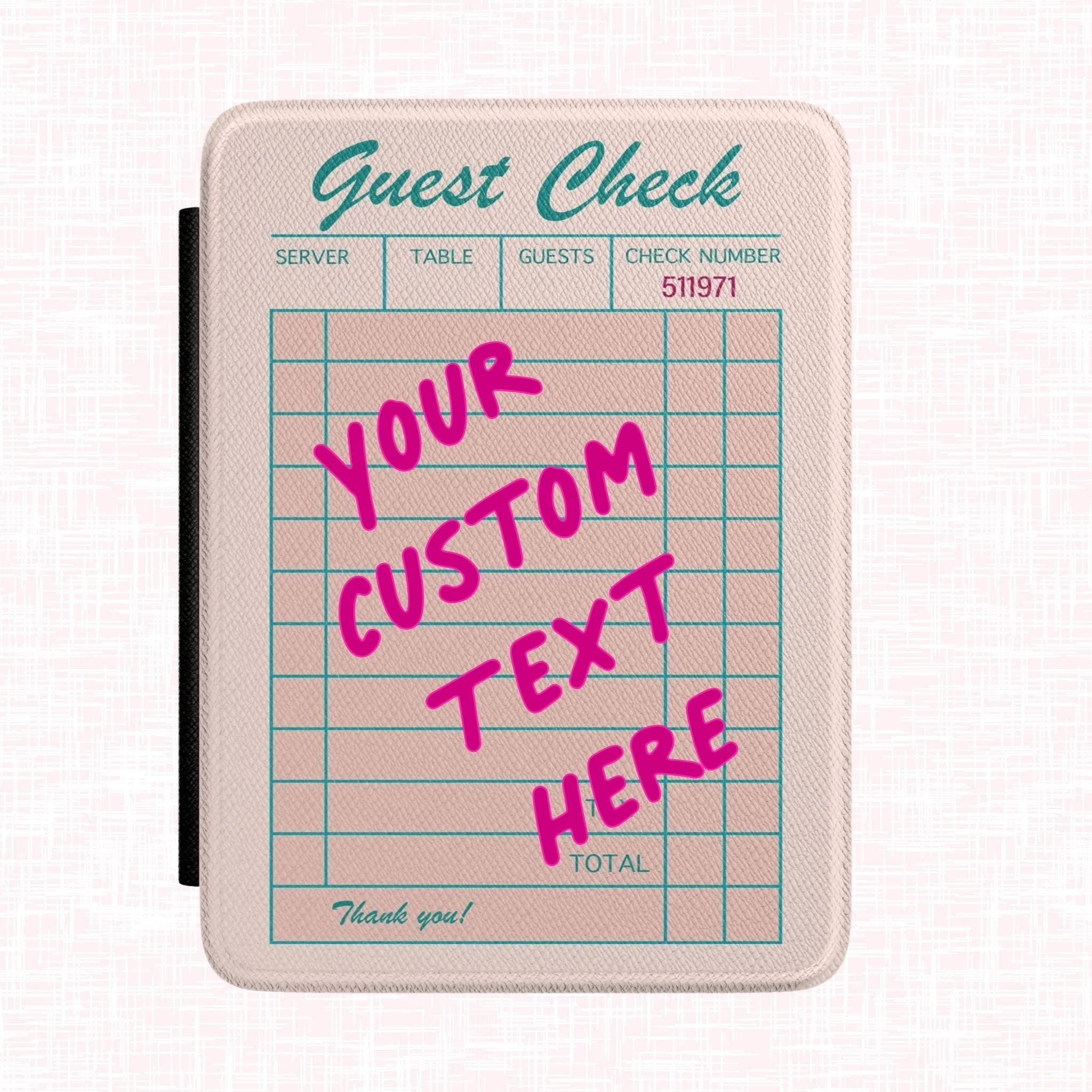 "The Guest Check" — a personalized Kindle case for the reader with opinions, featuring a retro diner receipt design in blush pink and teal with your words printed in bold hot pink handwritten script across the order lines, a witty and one-of-a-kind gift for book lovers.