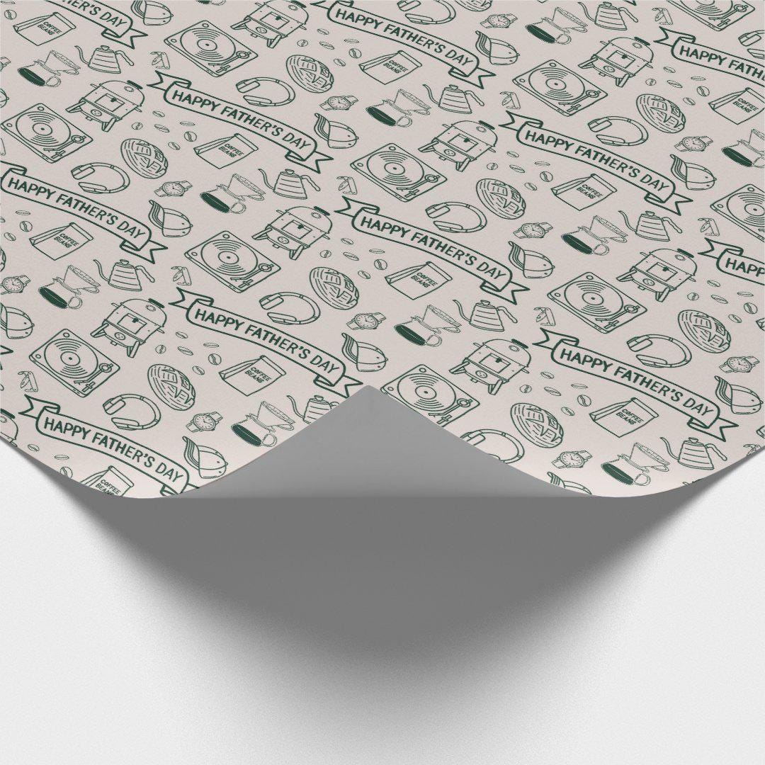 Father's Day wrapping paper featuring a hobby icon pattern — coffee gear, vinyl records, headphones, a BBQ smoker, watches, and "Happy Father's Day" banners — printed in forest green on a warm cream background. Set of 3 sheets.