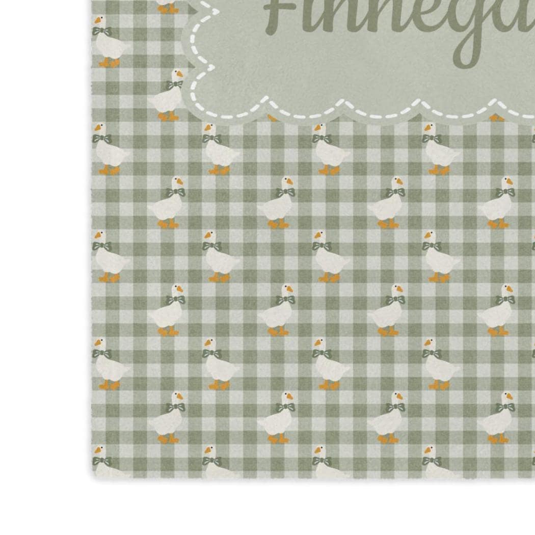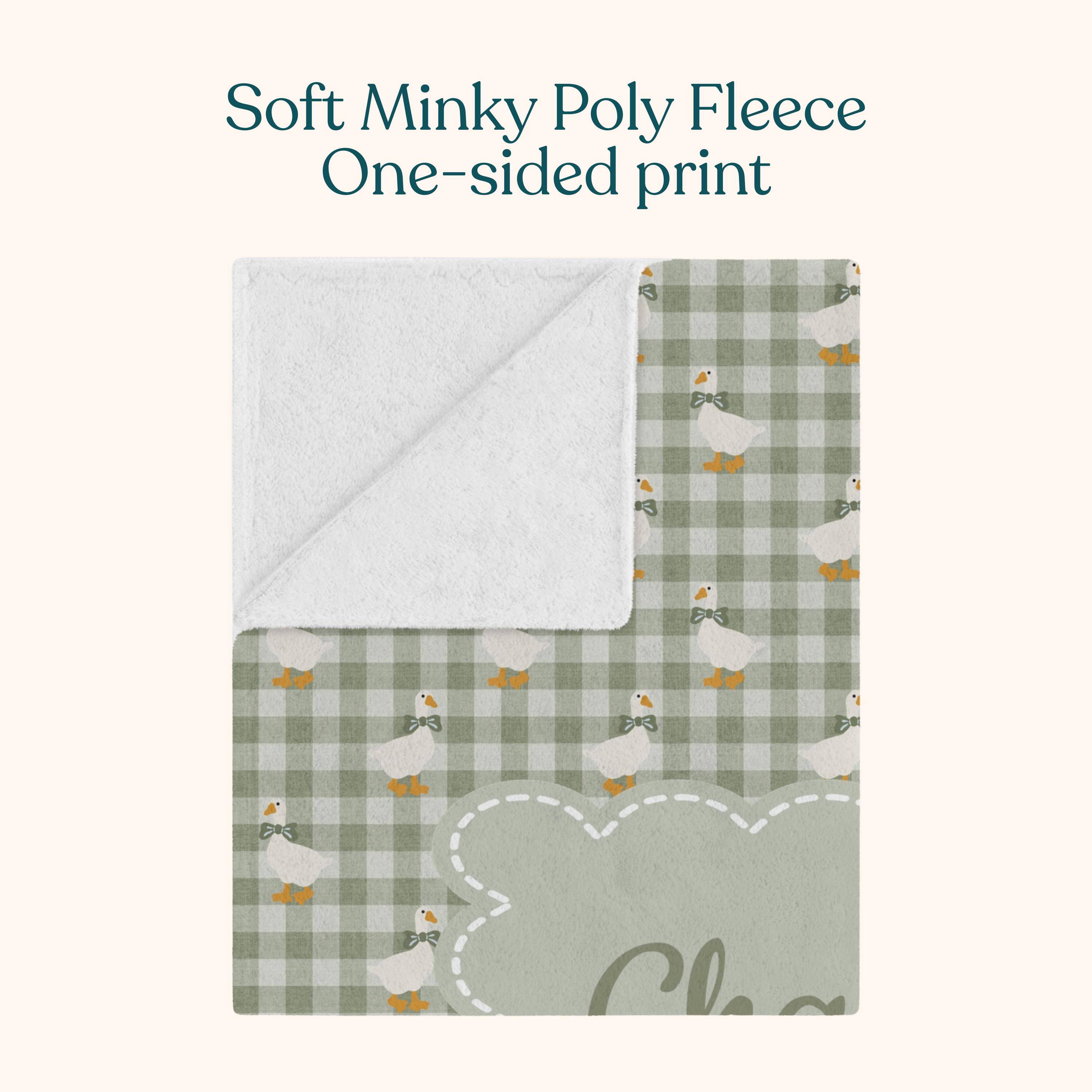 White geese wearing little green bows march across sage gingham in every direction. At the center, a scalloped cloud-shaped frame carries your child's name in a soft script that feels like it belongs in a storybook nursery. The front is printed with the full goose gingham design and name; the back is a plush, fluffy white fleece — the kind of softness that makes a blanket the one a baby reaches for every time.