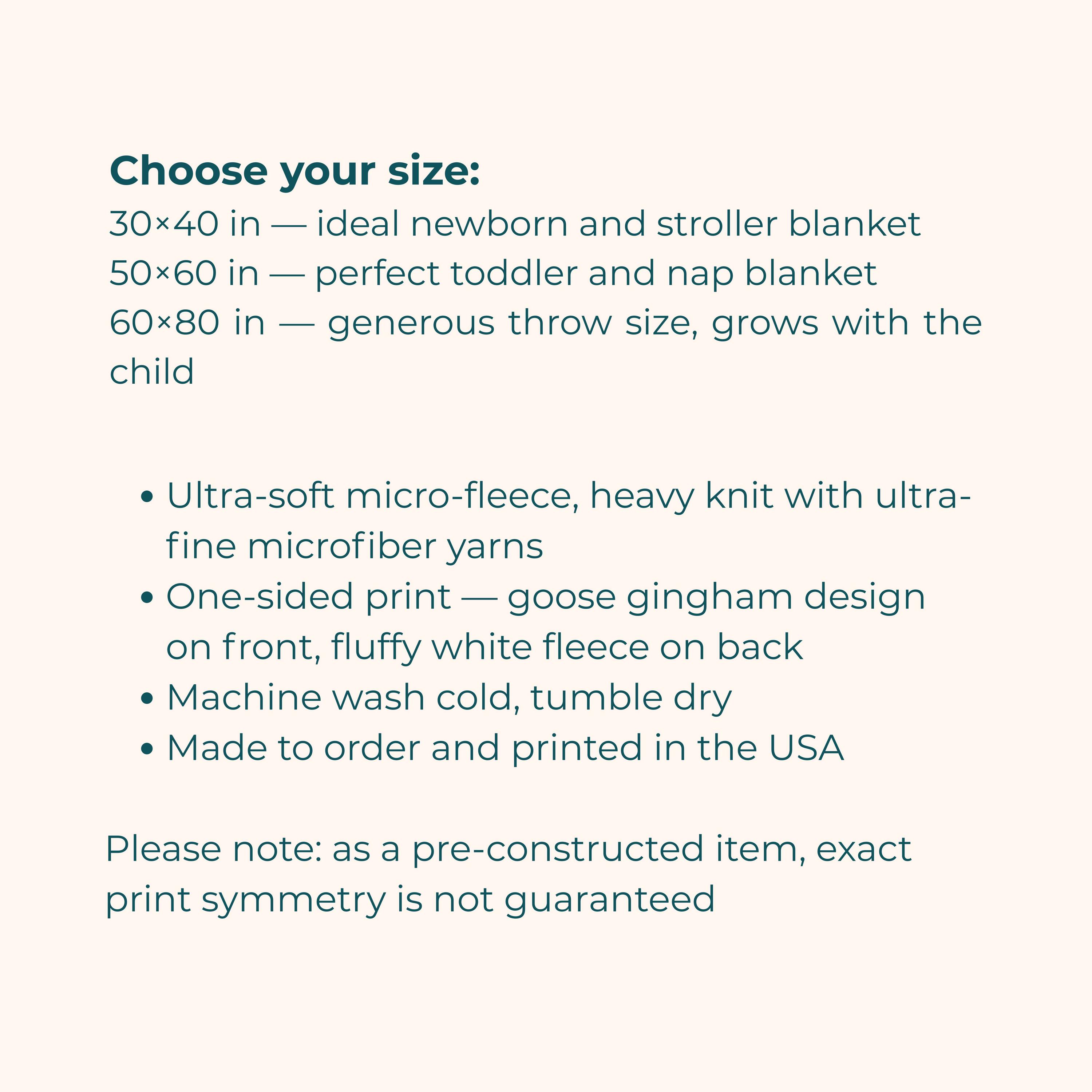 I designed the goose gingham pattern myself — it came from wanting a nursery print that felt warm and considered rather than mass-produced. The minky fleece makes it the kind of blanket that gets carried everywhere and washed a hundred times and still looks right. Every blanket is made to order in the USA with your child's name printed just for them.